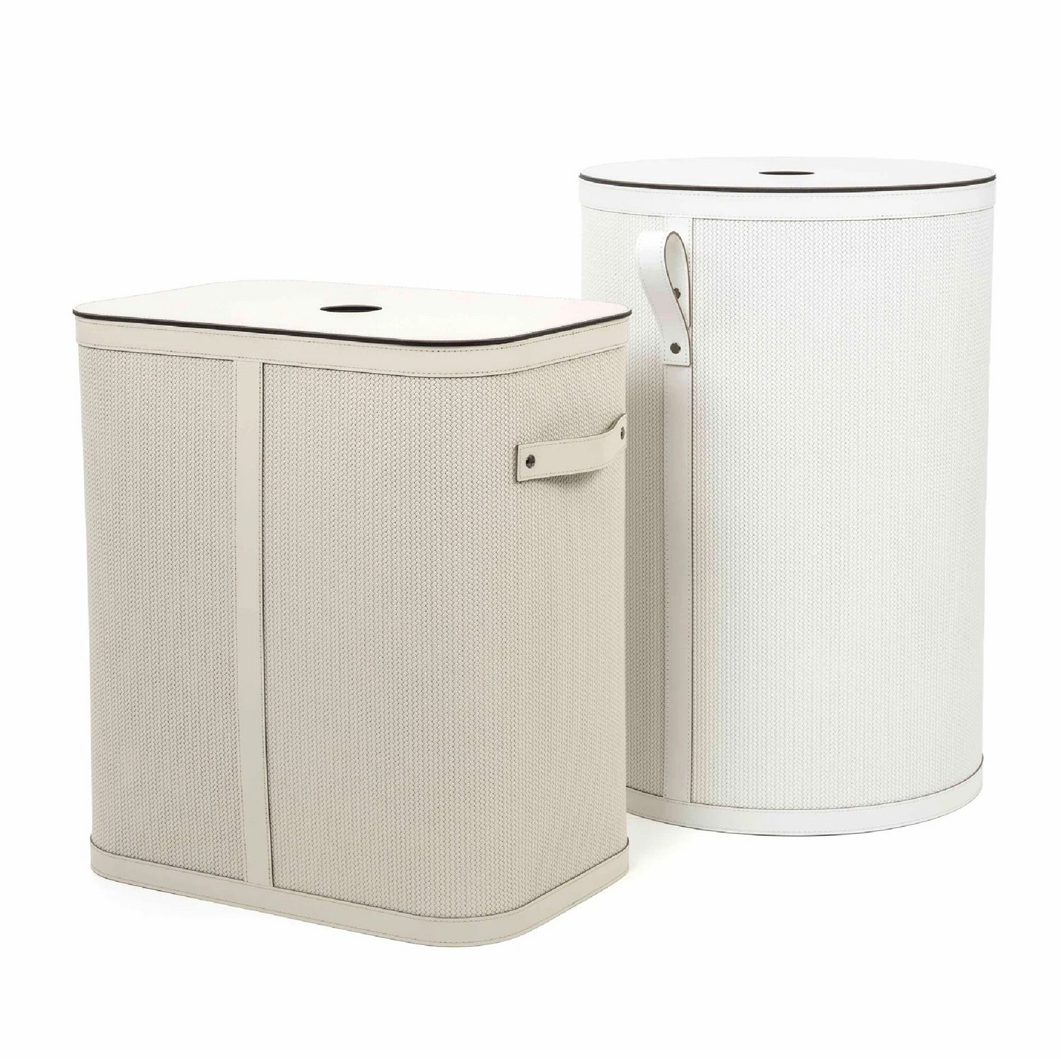Roda is a robust, generously sized round laundry basket crafted for both style and function. Its design elegantly merges woven leather with a smooth leather lid and fully upholstered profiles, creating a refined look inside and out. Available in subtle tone-on-tone or striking bicolor patterns, this basket adds a sophisticated touch to your space while offering ample room for your laundry needs.