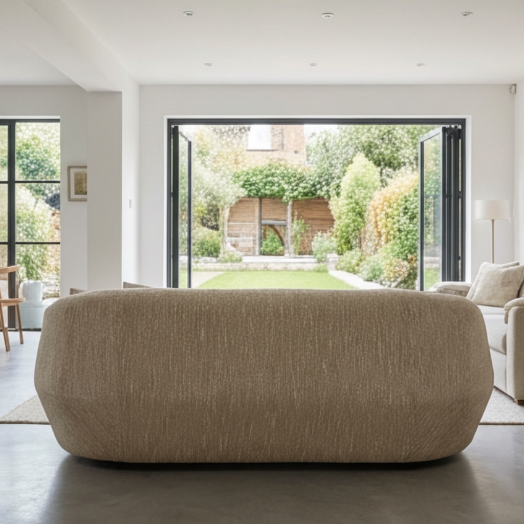 Elevate your living space with the OROA Modern Belinda 3-seater sofa—a refined, contemporary statement designed for everyday comfort. Upholstered in a soft beige 100% polyester fabric, Belinda’s sculptural barrel silhouette features generously rounded arms that flow into a curved back for a clean, minimalist look that feels inviting and warm. With an expansive seating surface and low-profile black feet, this modern fabric sofa balances relaxed lounging with understated luxury—ideal for bright, neutral interiors, modern apartments, and curated living rooms.