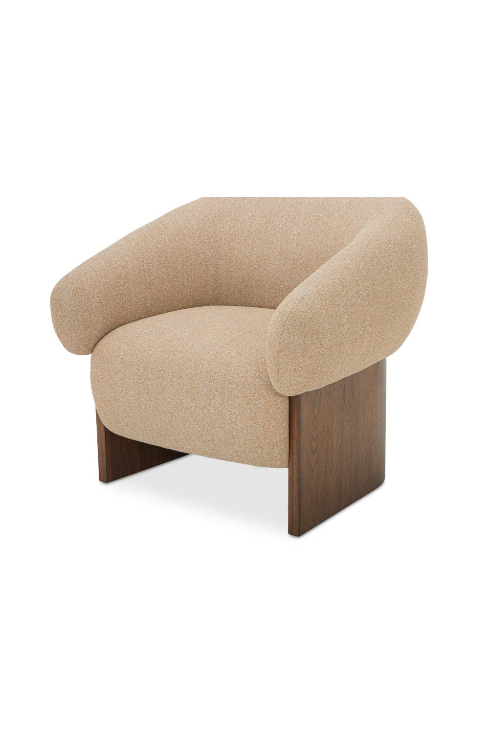 The Otto accent chair merges the robust grace of a walnut veneer over a solid rubber wood base with the delicate comfort of a plush, curved back and upholstered in a flecked micro boucle of 100% reclaimed GRS-certified polyester. With its nuanced texture, this piece floats atop a wooden foundation that brings lightness into any space.