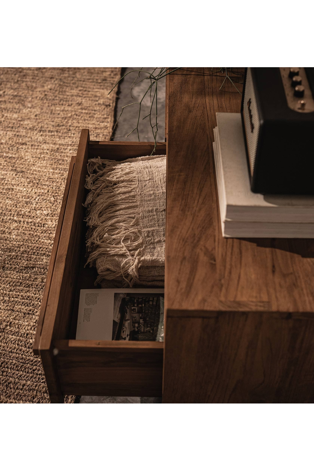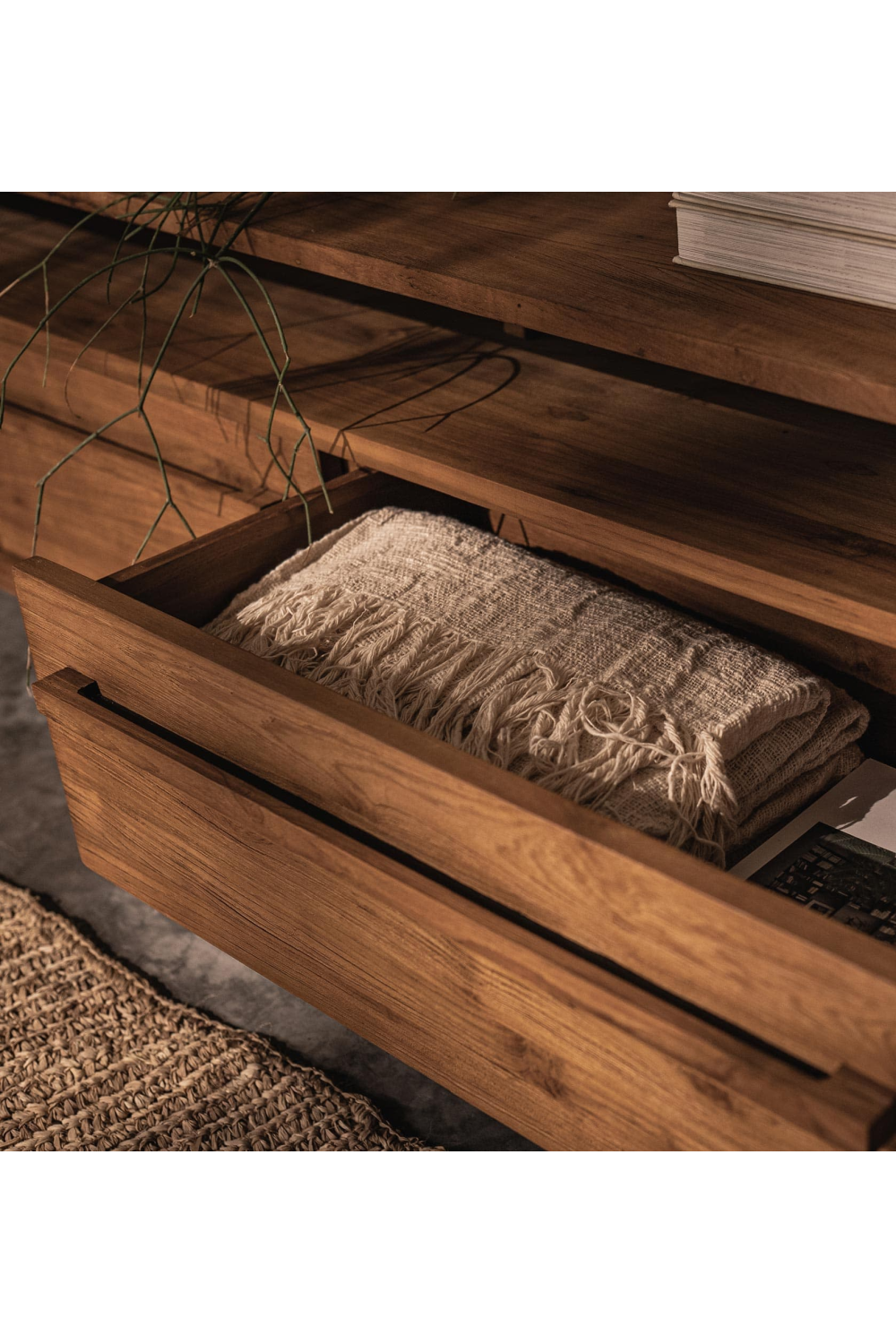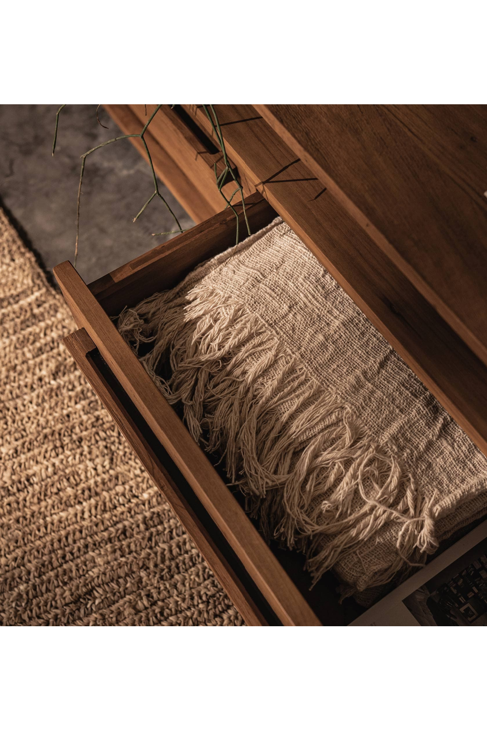 Whether you use it as a sideboard or a TV cabinet, the clean silhouette of the Outline Sideboard blends effortlessly into any room. Two spacious drawers provide sufficient storage space, while the open shelves at the top allow a perfect set-up for your books or electronic devices. The dresser is crafted from reclaimed teak and has iron legs.