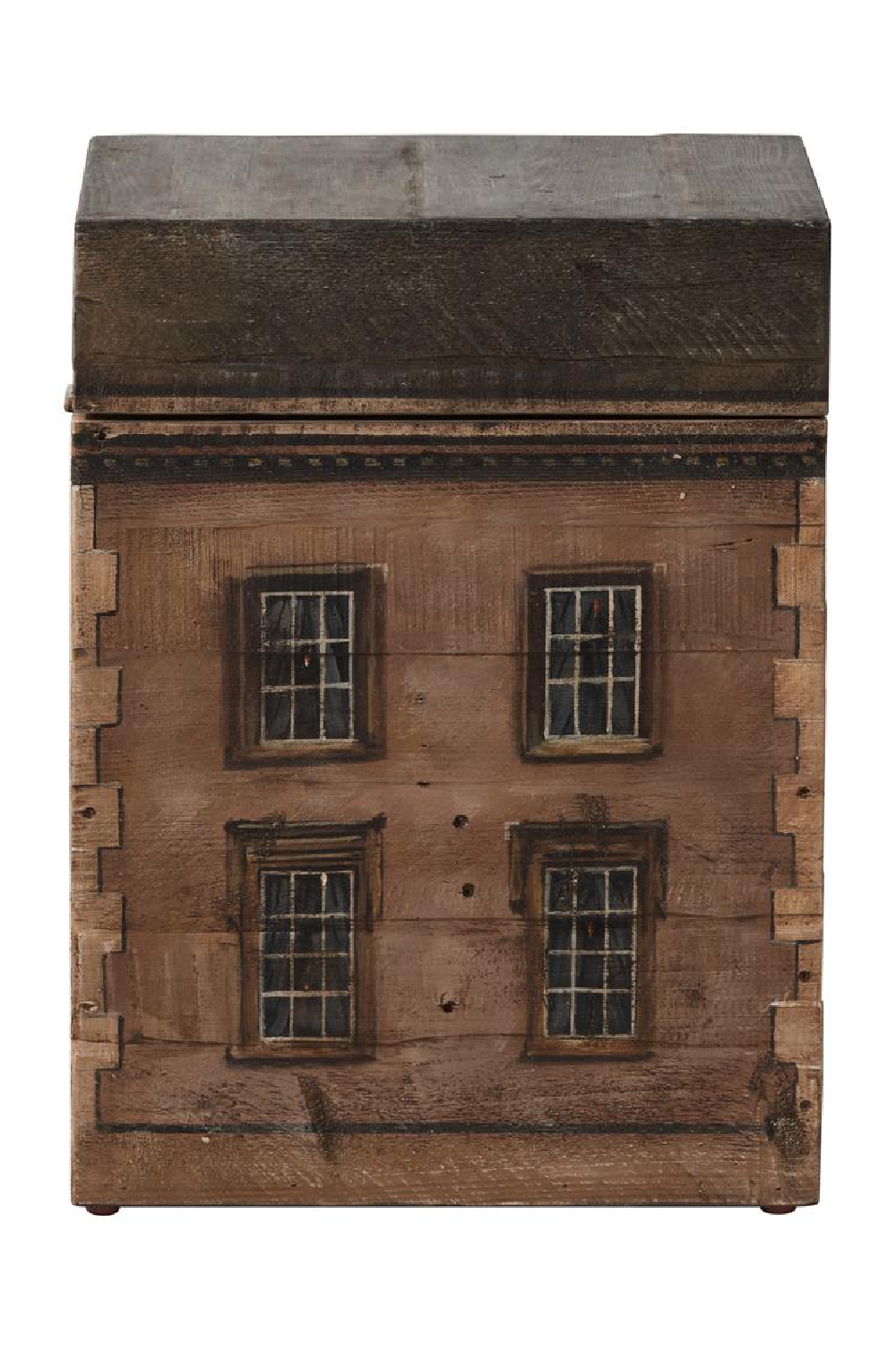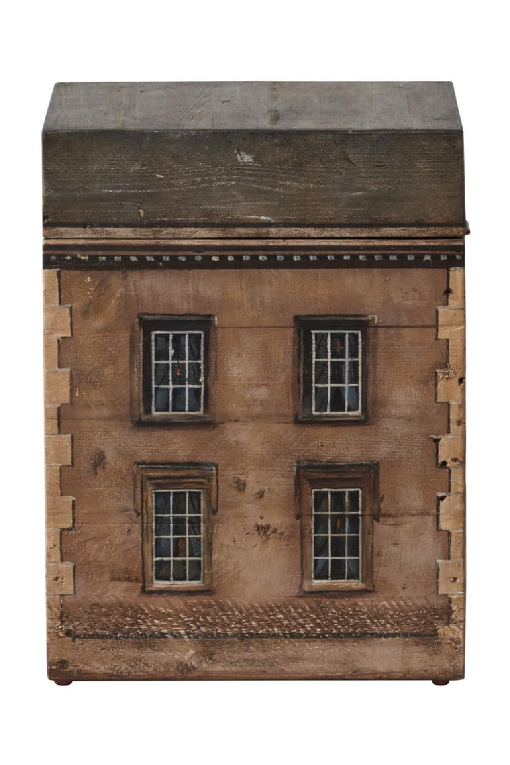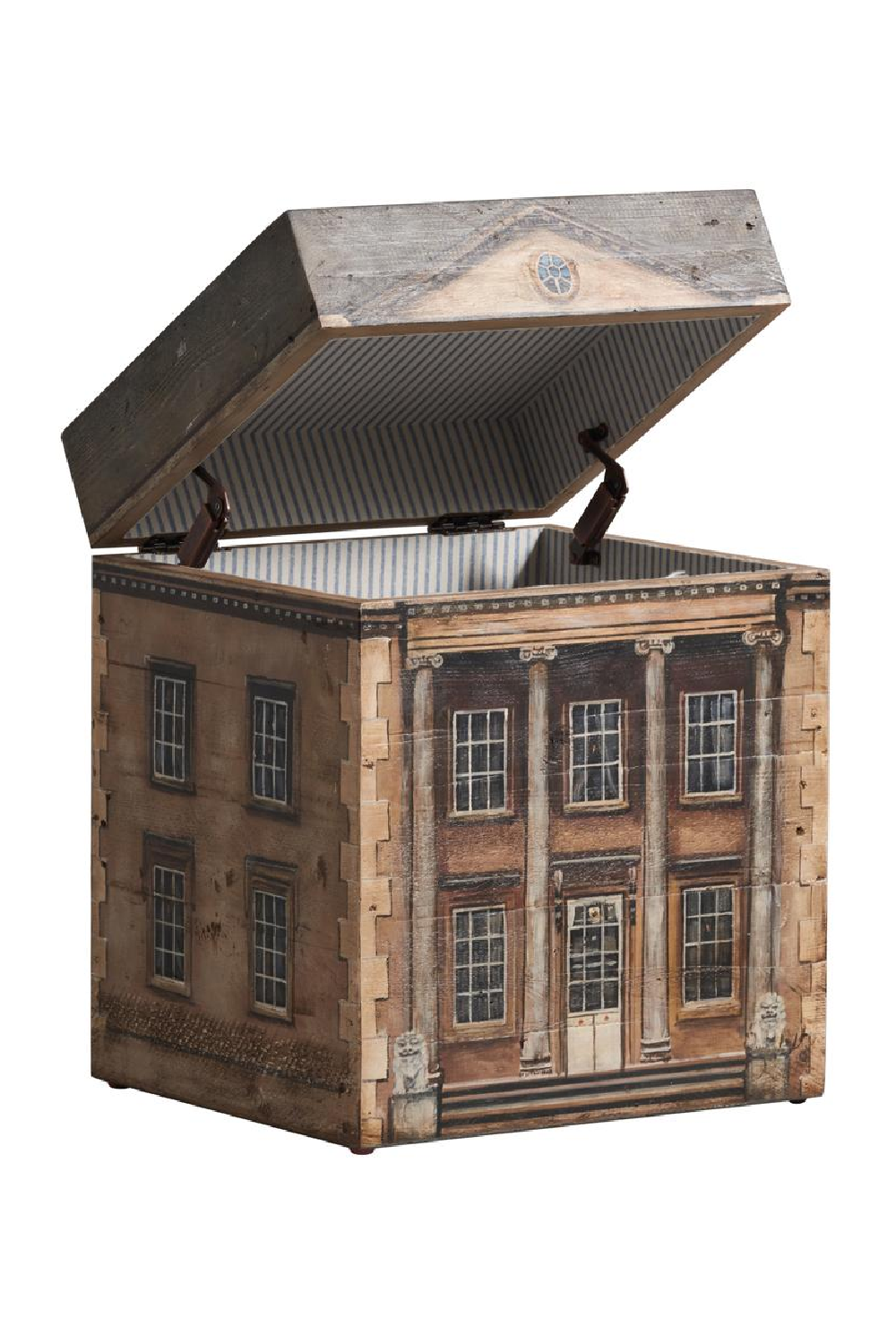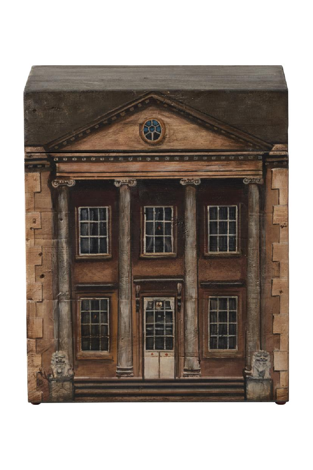 Inspired by grand English manors, this hand-painted storage trunk is crafted from reclaimed pine and brought to life with meticulous architectural detailing. Every surface is lovingly painted to resemble a stately home-columns, windows, lions at the steps, and all-creating a playful illusion that's bound to turn heads.