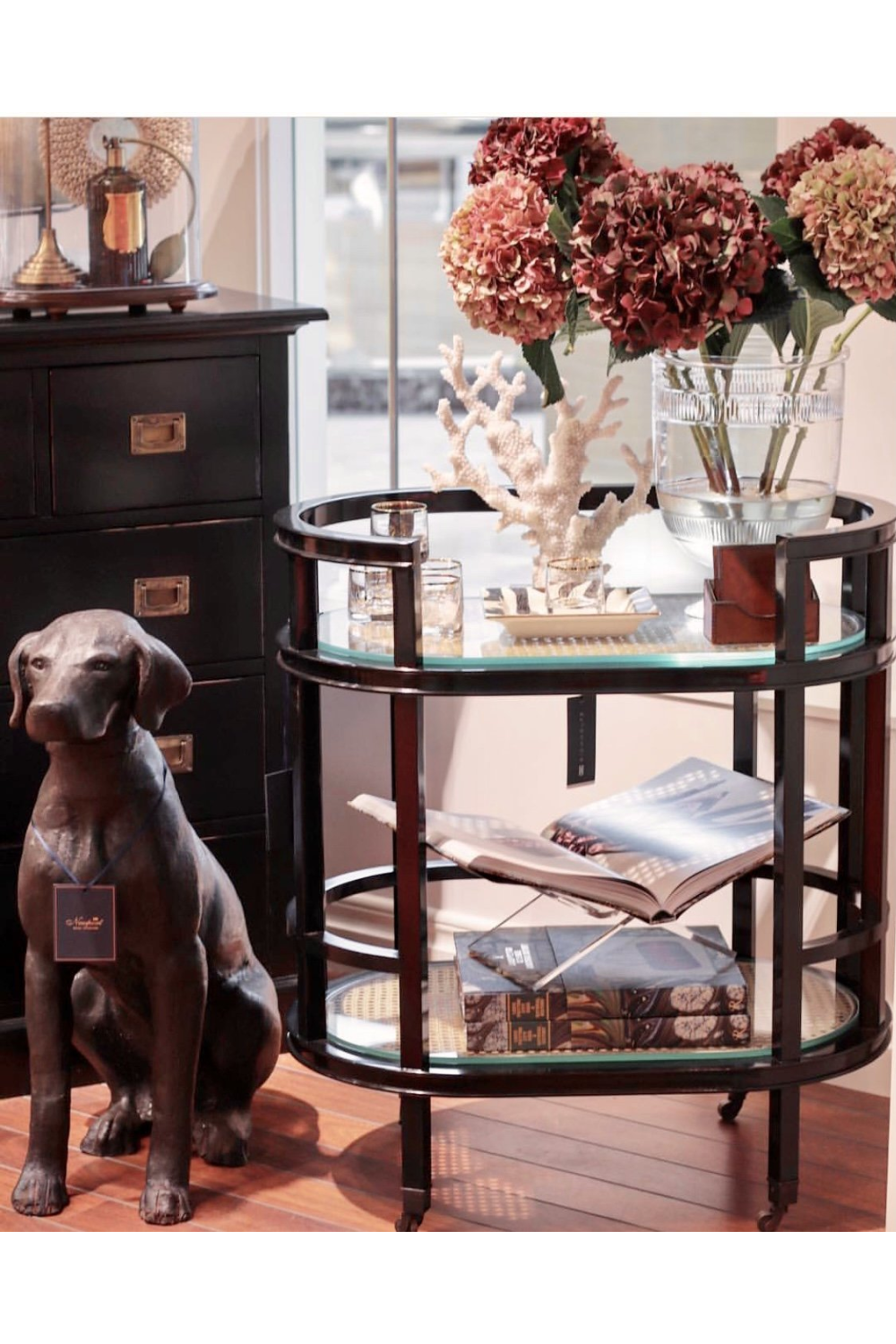 The elegant oblong Bahamas Trolley makes a gorgeous side table in your living room or conservatory. Comprising a mahogany wood frame with a black finish, it has shelves of natural mesh cane webbing and clear glass and decorative antique bronze castor wheels.