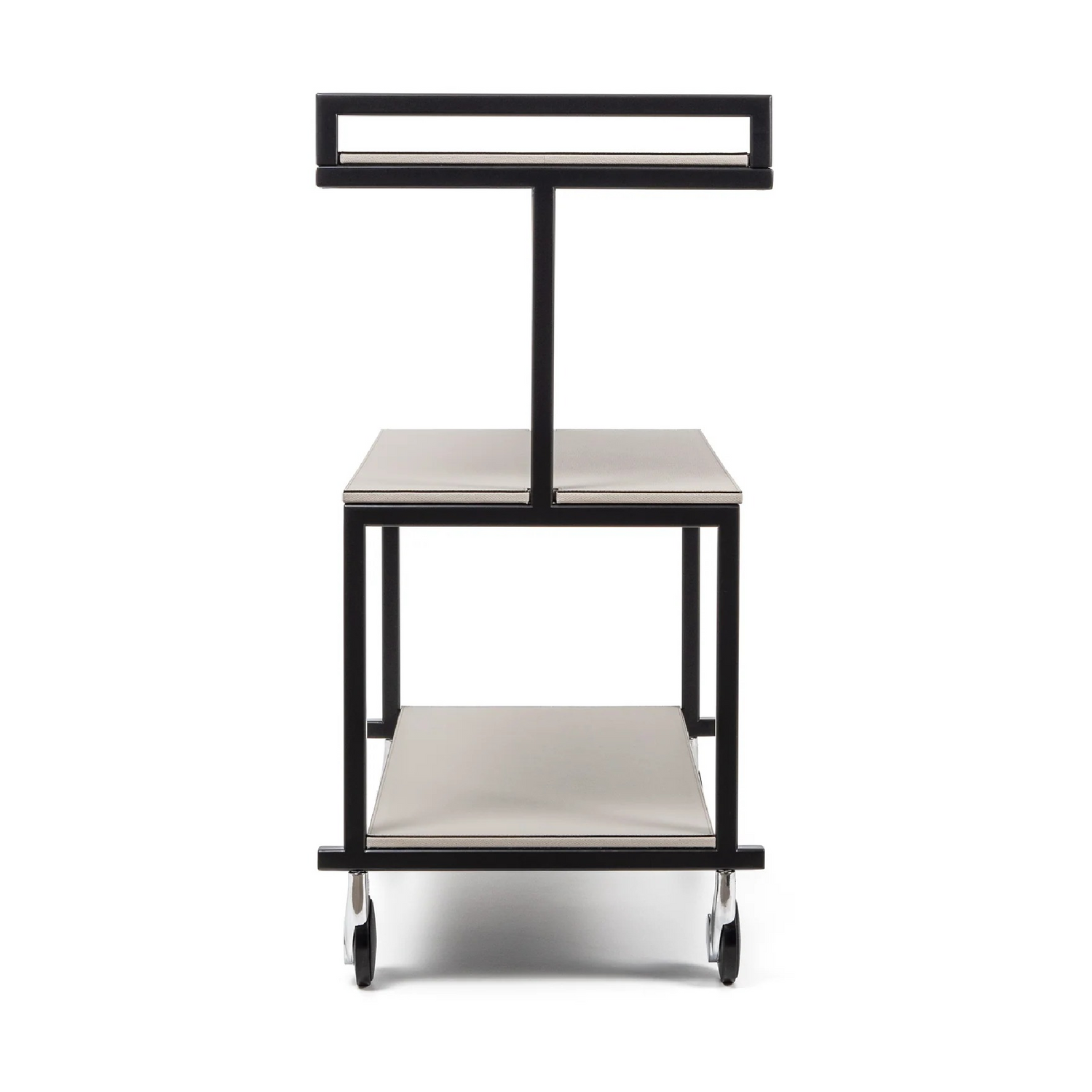 The Pinetti Albert serving trolley features three real leather shelves supported by a burnished metal frame, blending minimalist design with practical elegance. This unique piece is perfect for adding a refined touch to your living room or dining area. Elevate your space with this sophisticated and versatile serving cart. Contact us to explore personalized choices.