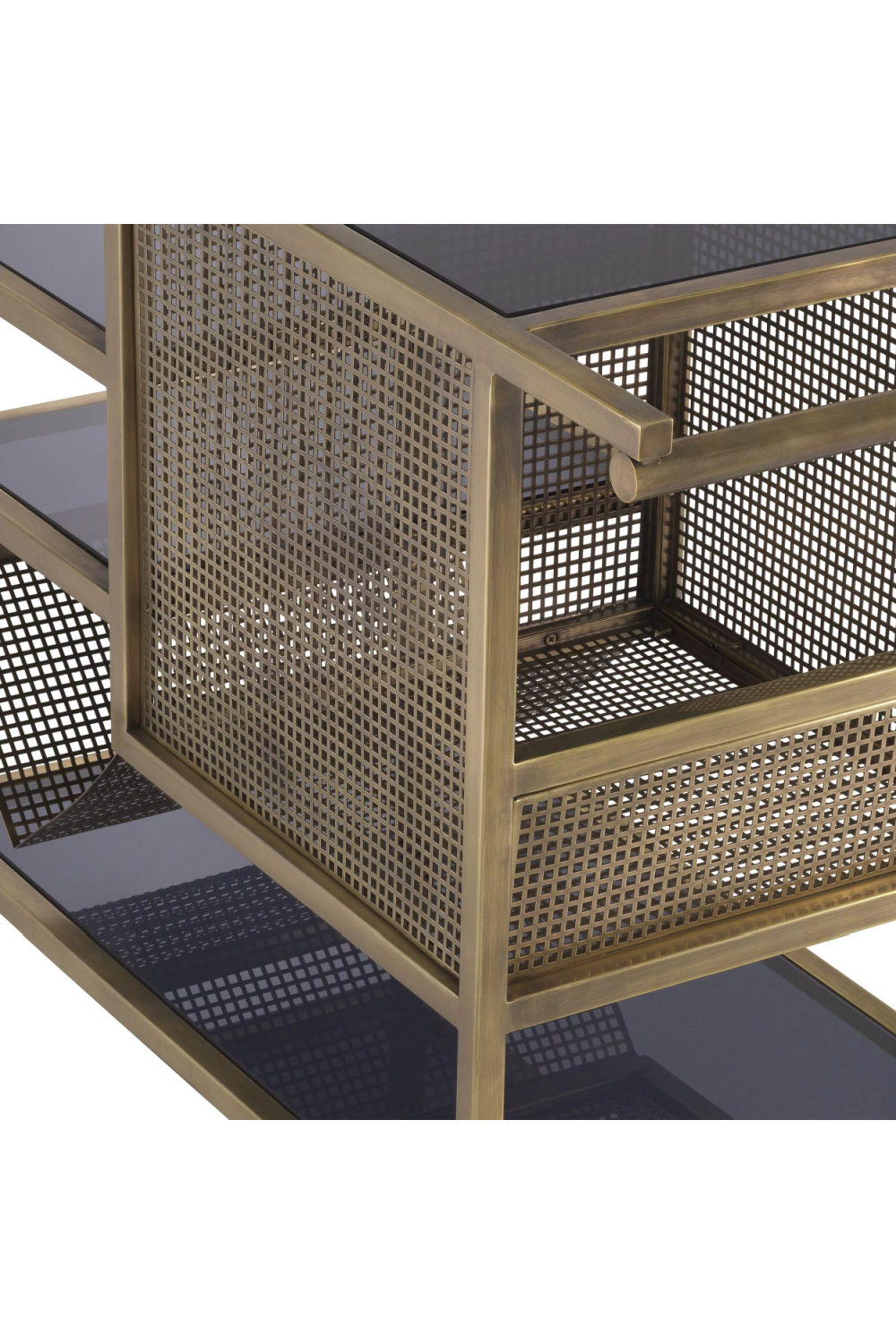 Evoke an elegant interior with the Sterling trolley by Eichholtz. This piece layers of smoked glass shelves framed in vintage brass finished metal. A luxurious wheeled storage for a stylish kitchen or dining room.