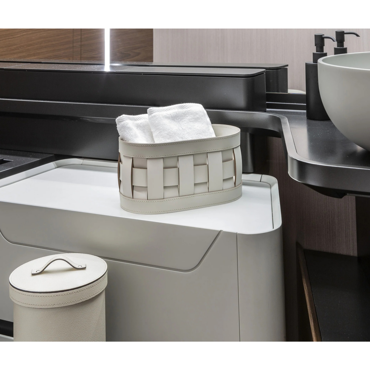 Braided Leather Washcloth Holder | Pinetti Demetra - 10"W x 6"D x 5"H / White is backordered and will ship as soon as it is back in stock.