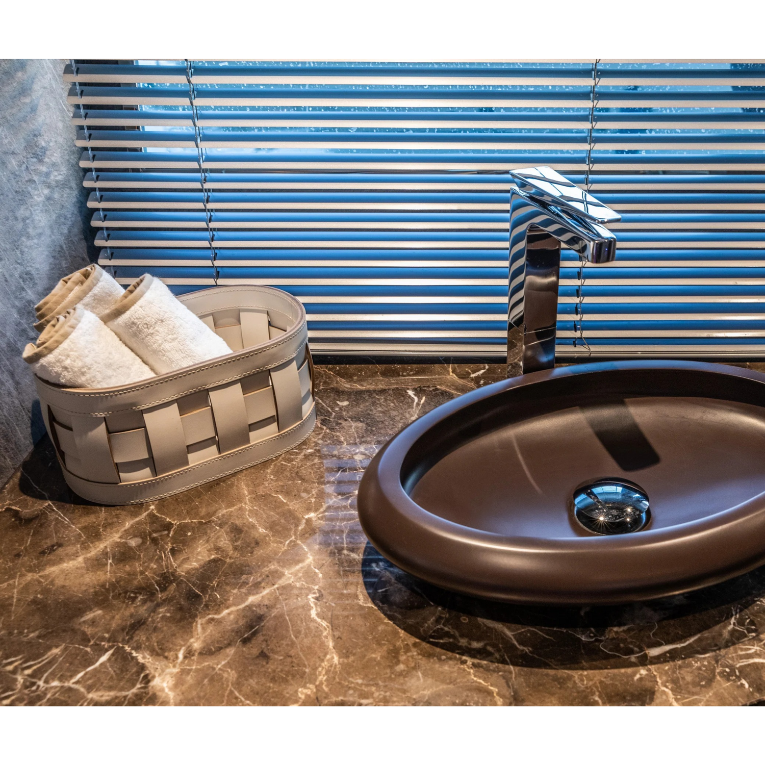 The Pinetti Demetra Braided Leather Washcloth Holder features an elegant woven design crafted from treated, water-resistant regenerated leather, making it ideal for both indoor and outdoor use. Available in two sizes, it offers a refined solution for organizing washcloths, sunglasses, or sunscreen, perfectly suited for yachts or bathroom spaces. Its sophisticated style and durable material combine practicality with timeless elegance.