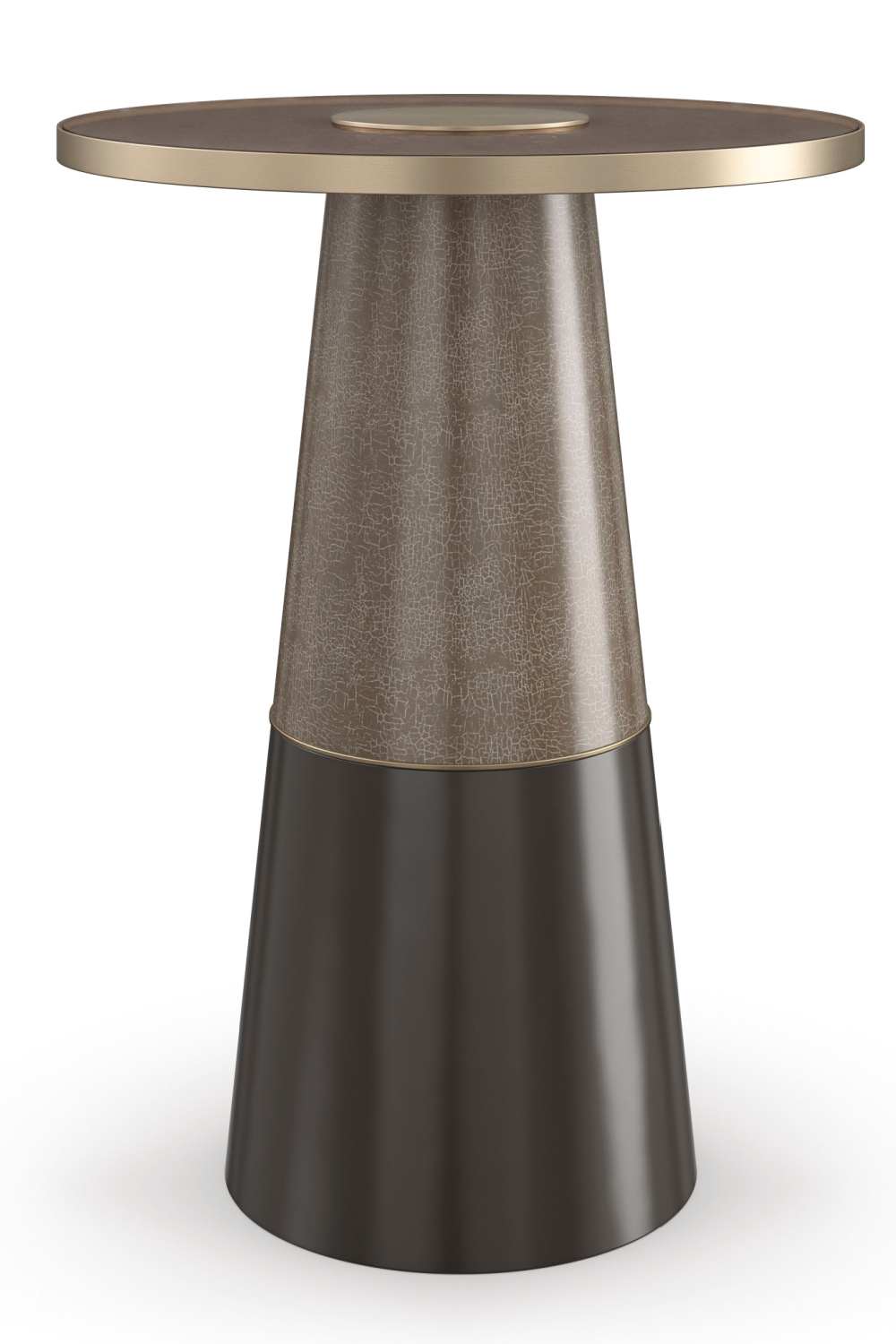 This go-anywhere spot table features a sleek silhouette and top-down view that resembles the aperture of a camera. A Forest Craze crackle finish adds depth and elemental beauty, complemented by an inset smoked bronze glass top with a metallic band and center disc in Brushed Gold. Style between two chairs to create composition and a unique focal feature.