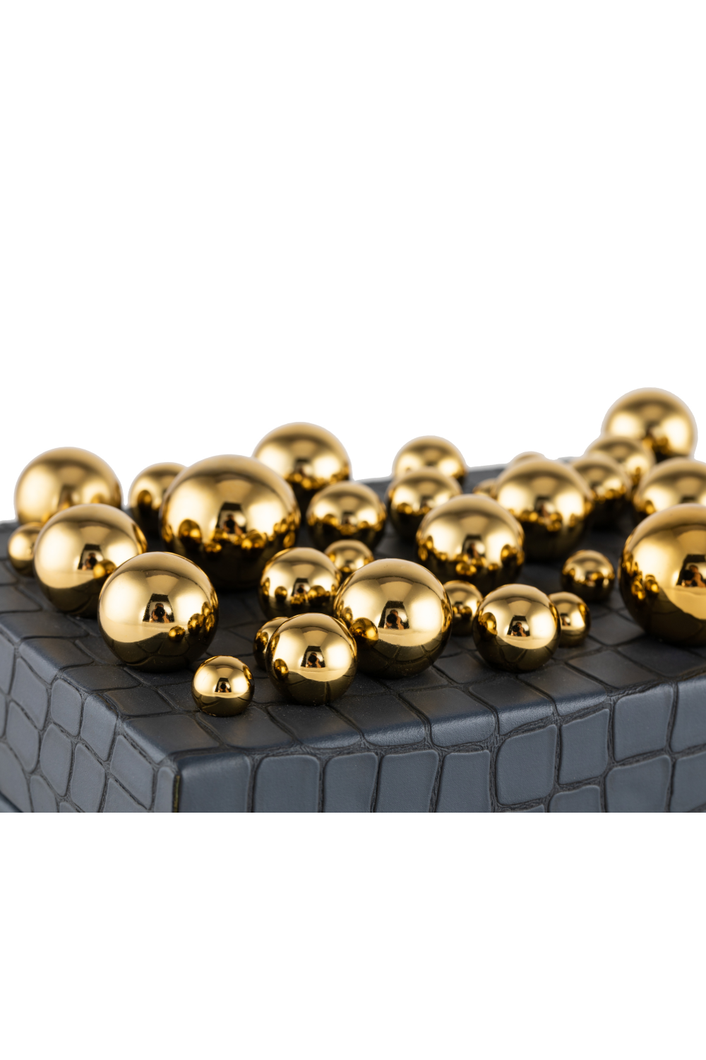 Wrapped delicately in crocodile embossed faux leather and topped with a concert of polished brass spheres – the hinged lid opens to reveal a lined interior perfect for your favourite jewels and delicate keepsakes.