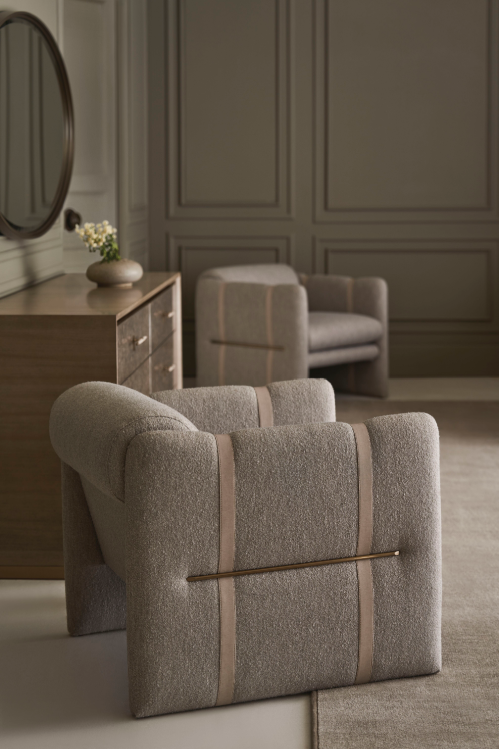 A refined assemblage of materials, the Hang Up dresser melds the beauty of wood with the allure of metal. Drawing the eye: drawer fronts in an ambiguous broken metallic leaf that takes on the shimmer of a frost-covered, candle-lit window. A recessed metal frame adds depth and dimension, complemented by tapered pulls, wrapped in hand-stitched faux leather, and accented by brushed gold and nickel. Features linen-painted interiors with top drawer dividers and a removable jewelry tray.