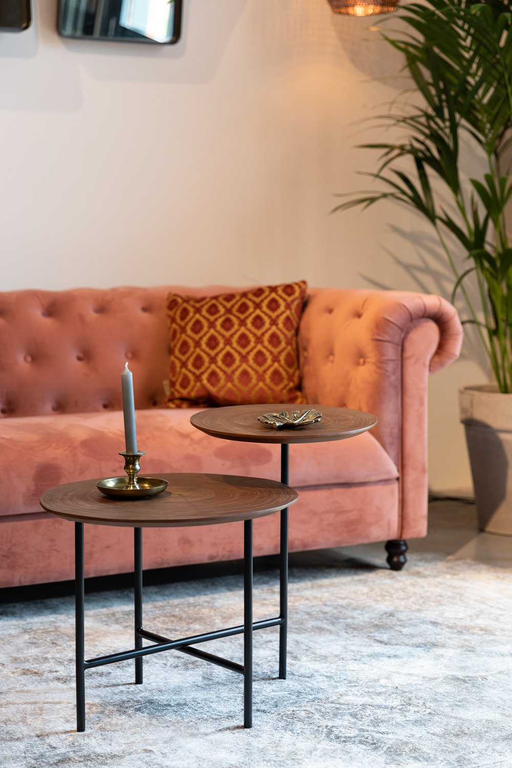 Side table Mathison is a real two-in-one-of-a kind. “Two in one” because of the obvious: two table tops. “One of a kind” because of the unique design. We gave the surfaces a very realistic walnut veneer with growth rings and even decorative cracks. The two heights of this distinctive and elegant design make this side table ideal for placing next to a chair or your living room sofa.