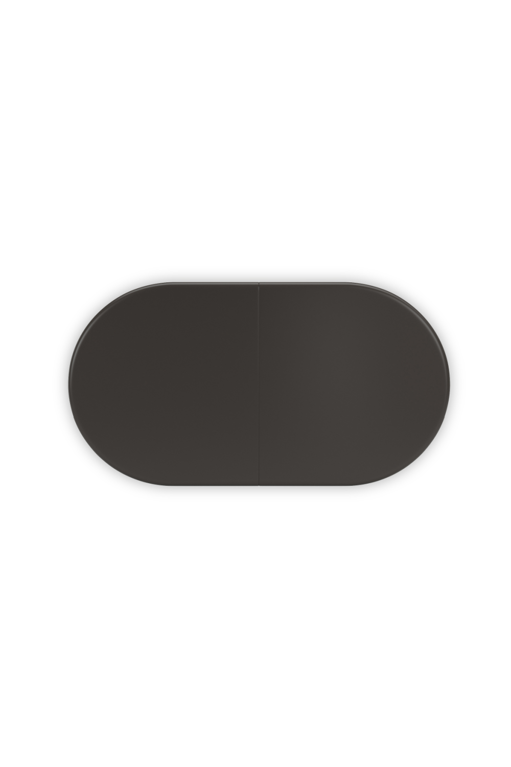With an elegant oval shape, this large dining table rests upon a two-piece, round barrel base that showcases delicate vertical reeds around its sides. The base can be separated to reveal flat sides with dramatic, reflective Whisper of Gold plates. Its top is finished in beautiful Matte Pearl, Oracle, and Dark Chocolate, trimmed with a Whisper of Gold metal band. Comfortably seats 12 when extended.