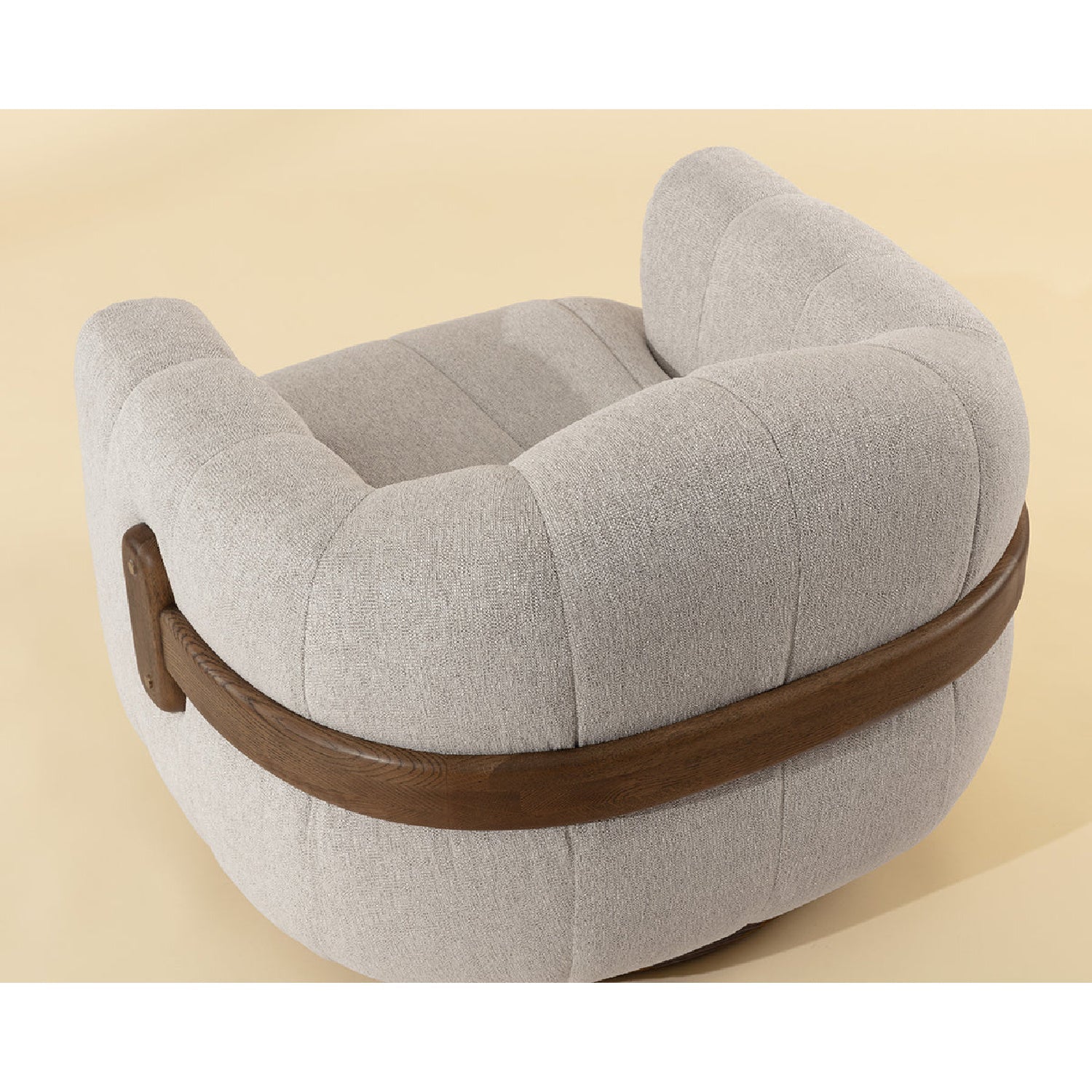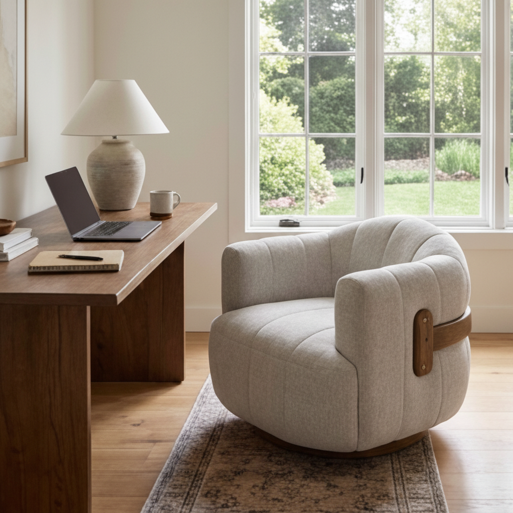 Bring elevated comfort and effortless movement to your living space with the Splendido Tadeo Cream Channeled Swivel Lounge Chair. Designed with a sculptural barrel silhouette and plush bolstering, this modern swivel armchair invites you to sink in and relax—perfect for conversation areas, reading corners, and stylish lounge settings. The dove cream textured upholstery adds a soft, light-neutral tone, while the warm brown oak wood swivel base grounds the look with natural warmth. A refined wood accent along the chair’s back, finished with antique brass details, creates a subtle statement that feels curated and upscale.