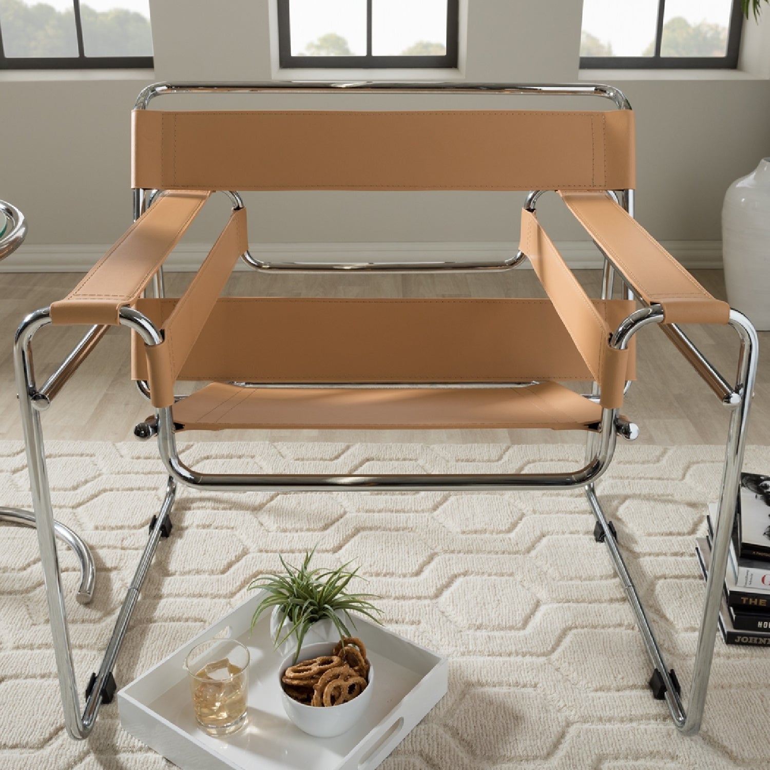 Bring the charm of 1900’s design to your space with the Jericho armchair. This chair features a strong chrome-plated metal frame upholstered in smooth leather. Tightly-pulled leather straps lend a stunning, mid-century inspired look while forming a cozy seat and armrests. The Jericho will arrive fully assembled and is fitted with non-marking to protect sensitive flooring. With a nod to expressive old-fashioned design, the Jericho armchair is a stunning addition to any private or public space.