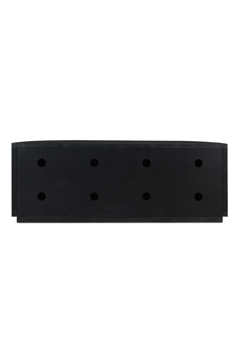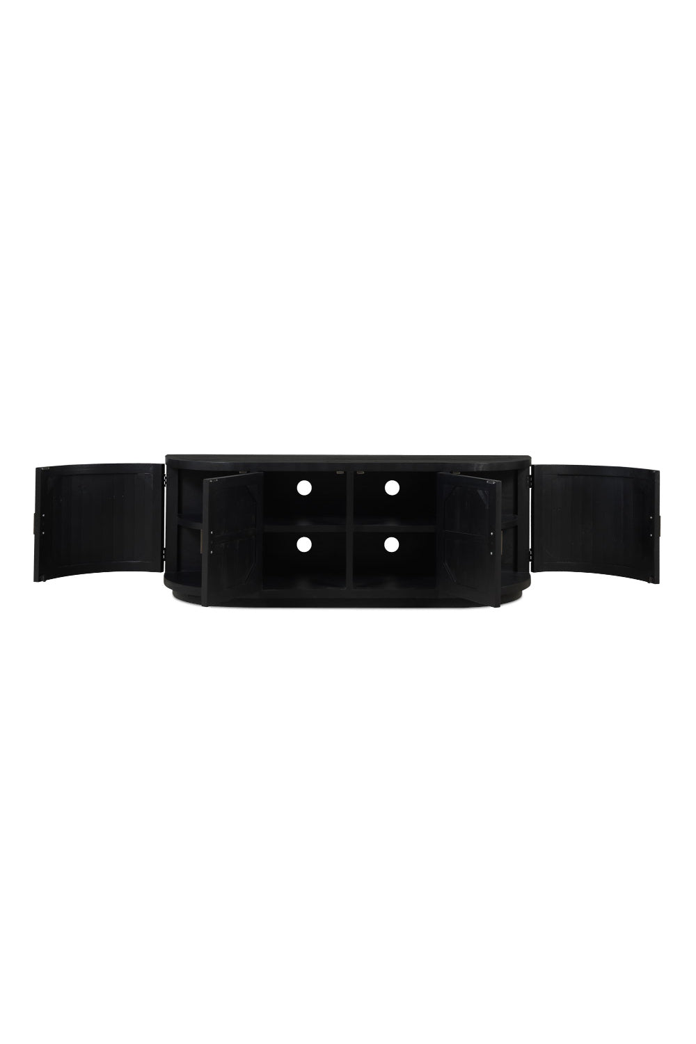 A blend of modern and vintage with its contemporary silhouette, the Nicola media cabinet features curved doors that smooth the bold textures of reclaimed wood. Its striking form stands on a recessed base, offering a stark contrast that beautifully complements transitional settings. The minimalist handle detail emphasizes the piece's elegant curves, while ample storage simplifies the organization of media essentials inside.