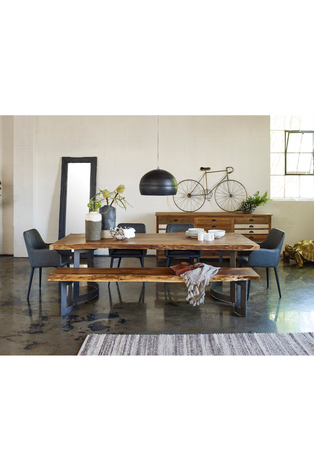 A celebration of nature's artistry, the Bent dining table is expertly crafted from solid acacia wood, exquisitely highlighting the wood's unique knots and whorls through its rustic live edge detailing. This table's expansive surface features a substantial 2" thickness that gracefully displays the wood's distinct character, while a robust industrial metal base provides a striking contrast.