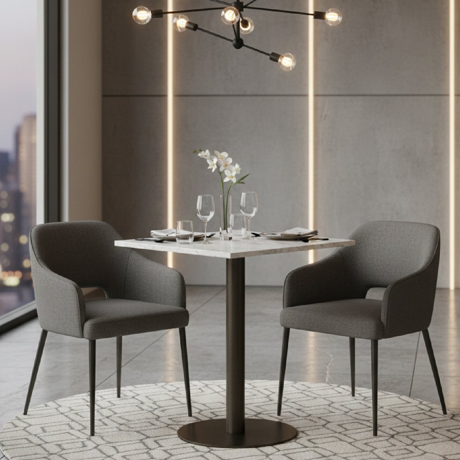 An Art Deco inspired 24" square bistro table featuring a white marble top with a pewter finished steel base. Perfect for restaurants and smaller dining spaces. As marble is a natural material, unique veining, pitting, fissures, micro-cracks and color variations are all characteristics that add to the uniqueness and beauty of each piece.