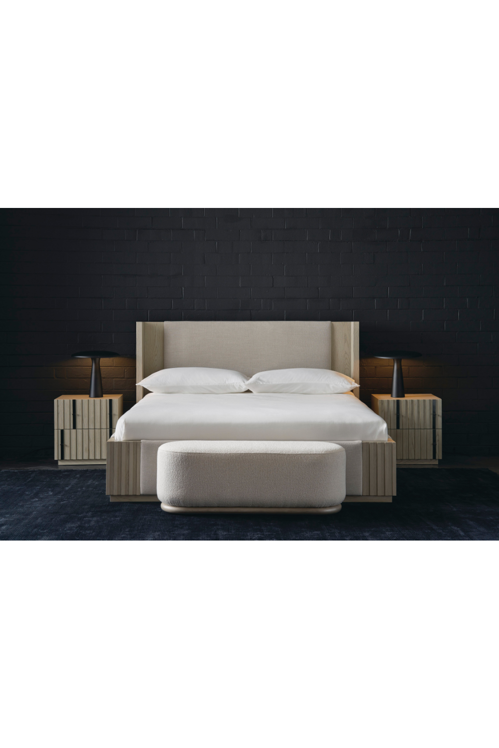 Slat-detailed drawers make a striking statement, adding layers of visual texture and dimension to bedroom interiors. Crafted in open-grain oak veneers, this larger bedside version of Clancy features two stacked drawers with minimal pull panels in matte black metal.