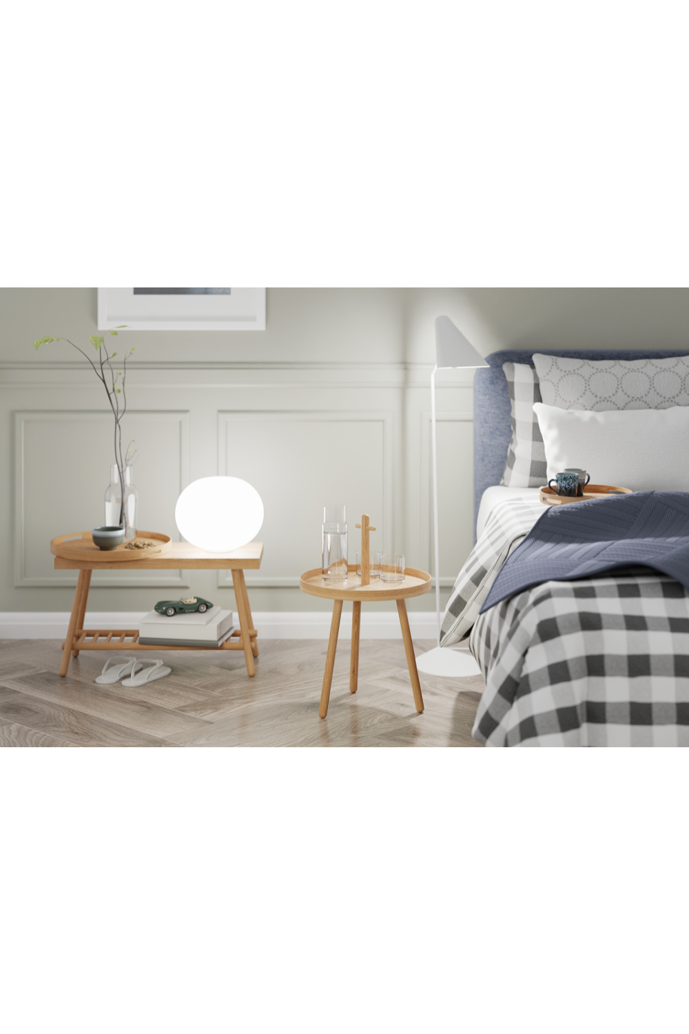Busboy 450 round serving tray’s streamlined profile cuts a modern look. It’s the essential accessory for serving morning coffee, tea and snacks or evening cocktails and drinks. The tray has two slotted handles for portability and a slim lip edge to stop spills and prevent things sliding off. Finished with a matt lacquer to protect against stains, it’s both hardwearing and stylish. Busboy is made from sustainably harvested natural American white oak and oak veneers, selected for their warm color, beautiful grain pattern and traditional hardwood durability. All edges look crisp but are carefully hand sanded to make them soft to the touch. Finished with a matt, water resistant lacquer. Design by Lincoln Rivers.