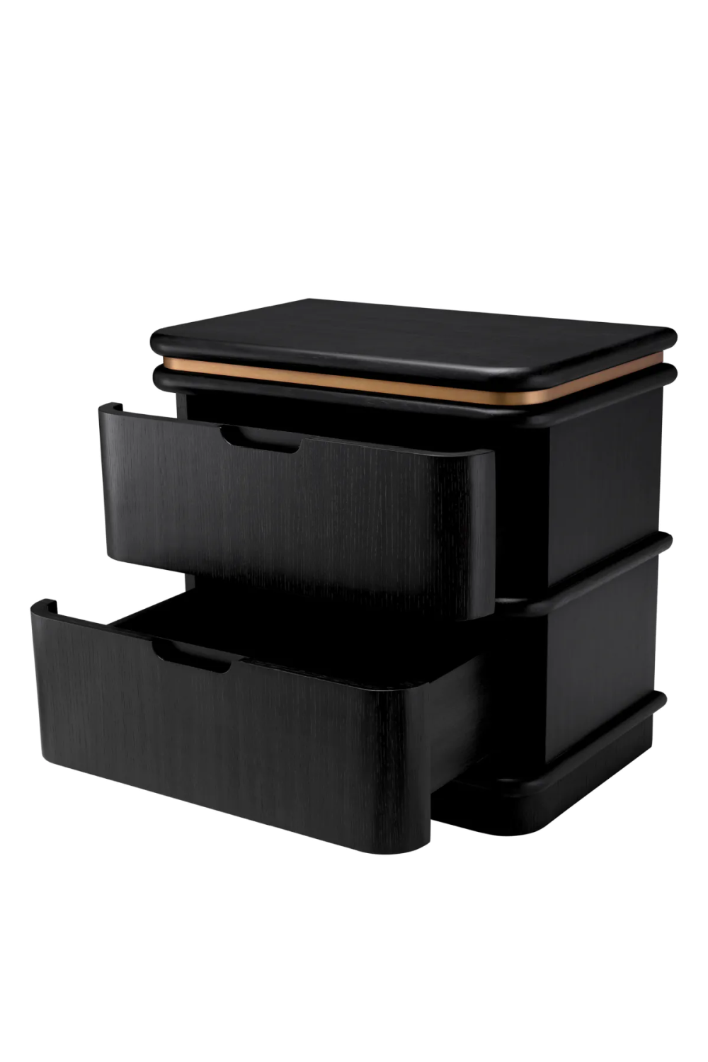 The Constanzo Bedside Table is a stunning addition to any bedroom. With its charcoal grey oak veneer and brushed brass finish, this combination of premium materials and stylish design makes the Bedside Table Costanzo both a functional and aesthetically pleasing piece, providing storage convenience while elevating the overall ambiance of your bedroom.