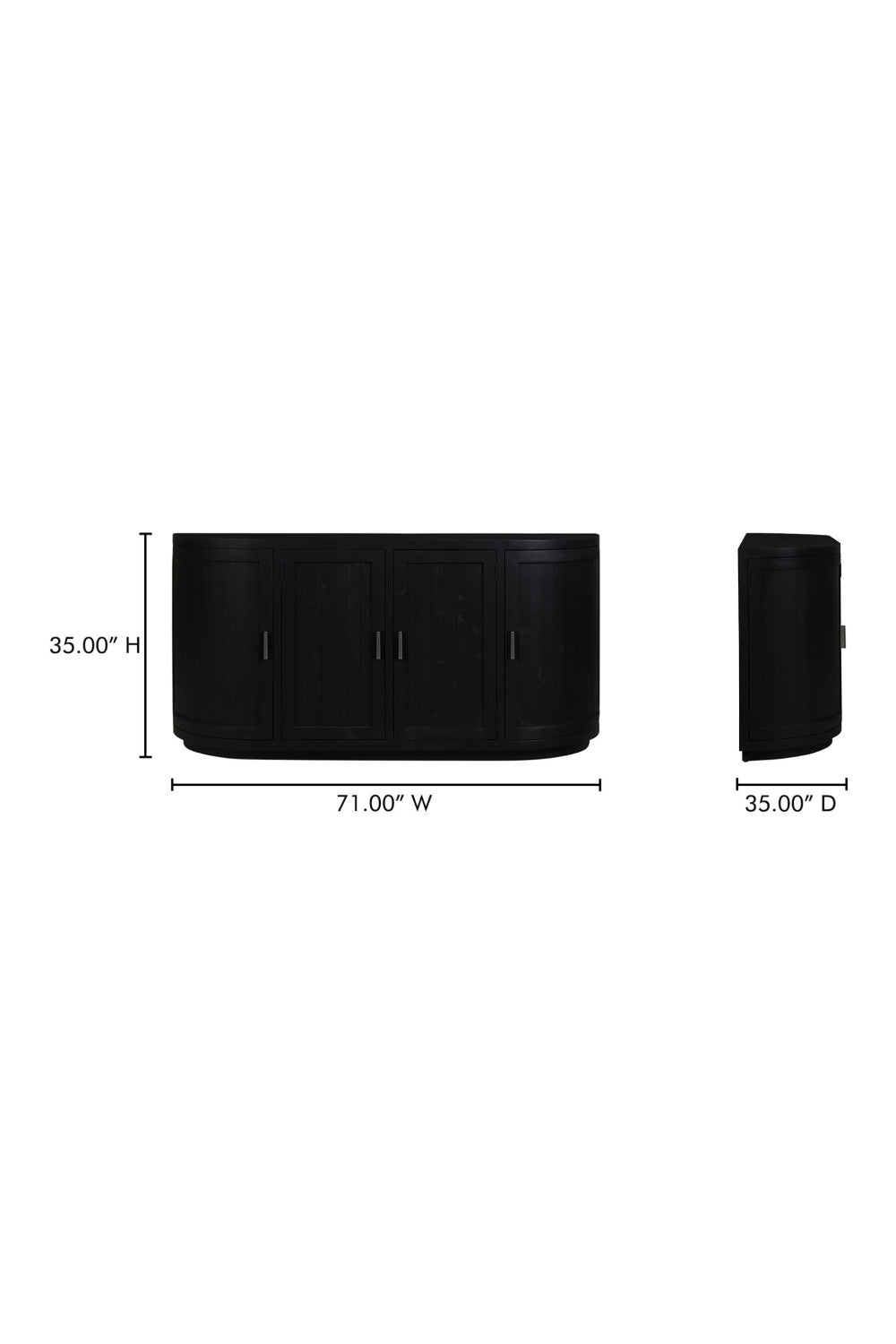 Rustic charm and contemporary design come together through reclaimed pine in the Nicola sideboard. Featuring curved doors that soften its texture, its contemporary recessed base contrasts with the rustic wood, offering a modern silhouette ideal for transitional spaces. The simple handle detail accentuates the curved design, with generous storage inside for essentials. At a comfortable 35" height, it's designed for both functionality and style, fitting seamlessly into the dining area.