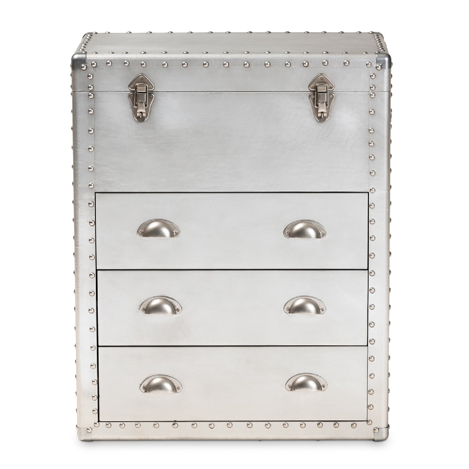 Bring chic industrial style into your space with the Serge cabinet. Constructed from wood and metal, the Serge features one drawer and one concealed compartment, behind a door, to keep items organized and out of sight. Polished silver metal drawer handles add a sleek touch. Inspired by vintage storage trunks, the Serge is embellished with rivets and corner protectors. Use this piece as a nightstand in the bedroom or as an accent piece in the living room.