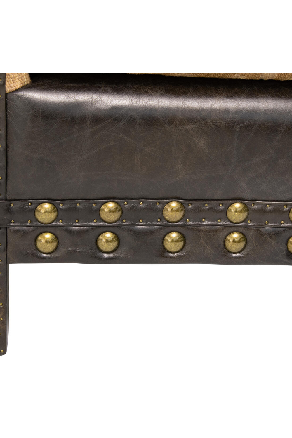 A classic armchair in worn fudge brown leather with a richly colored carpet kilim on the back and sides designed by Andrew Martin. With big, brass stud detailing on the profile, Marlborough is the epitome of old-world charm. Sink back into this and smoke a cigar to complete the look.