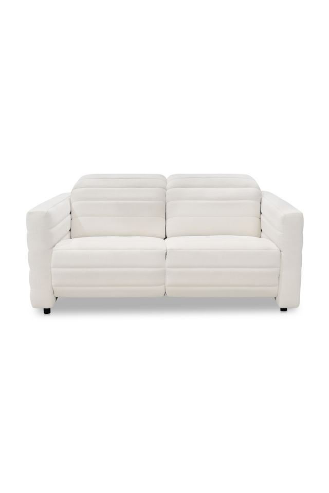 The Juno power recliner sofa's sleek silhouette and horizontal channel detailing exude modern elegance. Hidden buttons effortlessly transition between positions, while the adjustable headrest offers personalized support.
