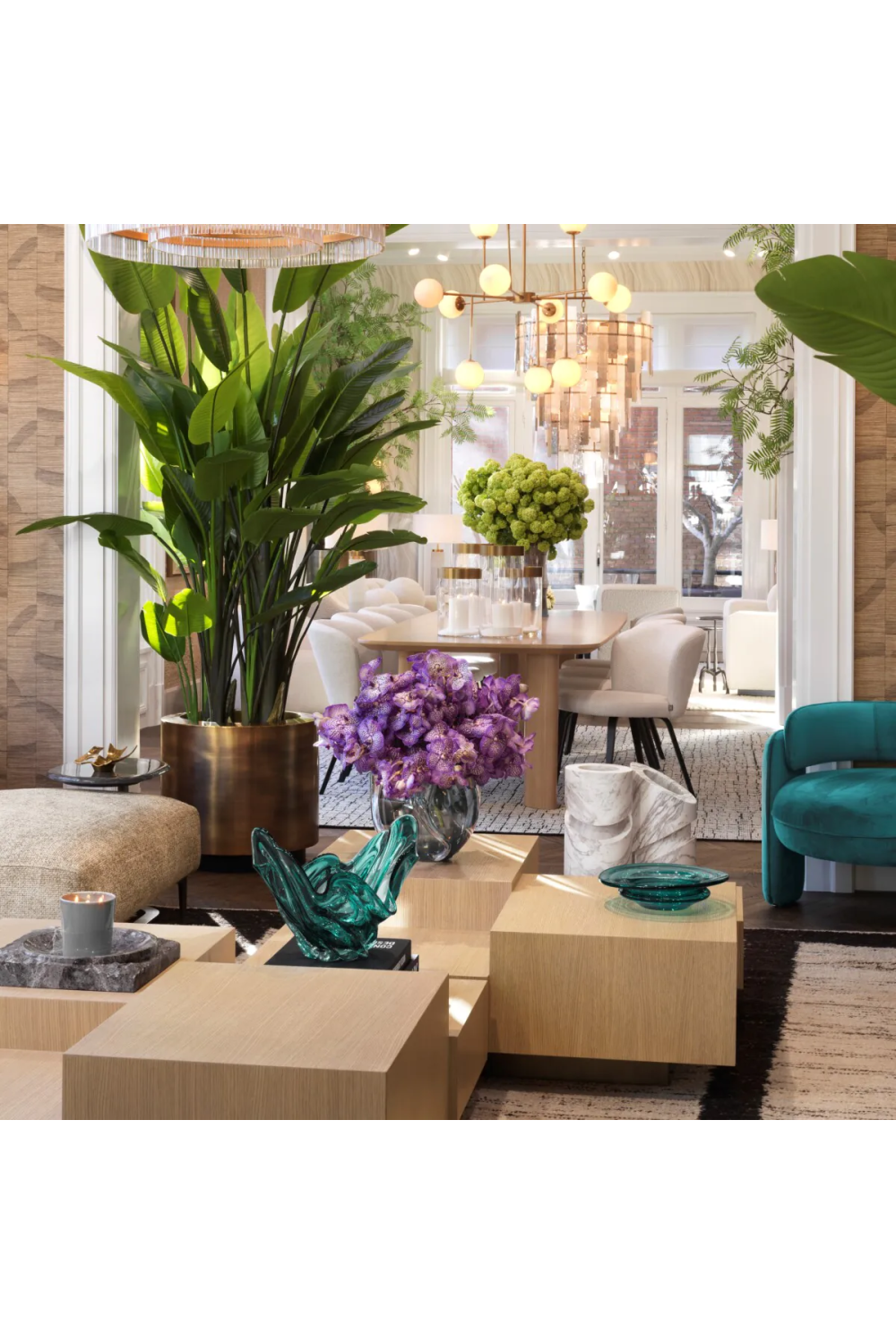 A sculptural coffee table perfect for urban spaces, Nerone by Eichholtz adds dimension and depth to the interior. It's crafted with oak and metal base that is designed to last. The tabletop has unique geometrical blocks in different heights.