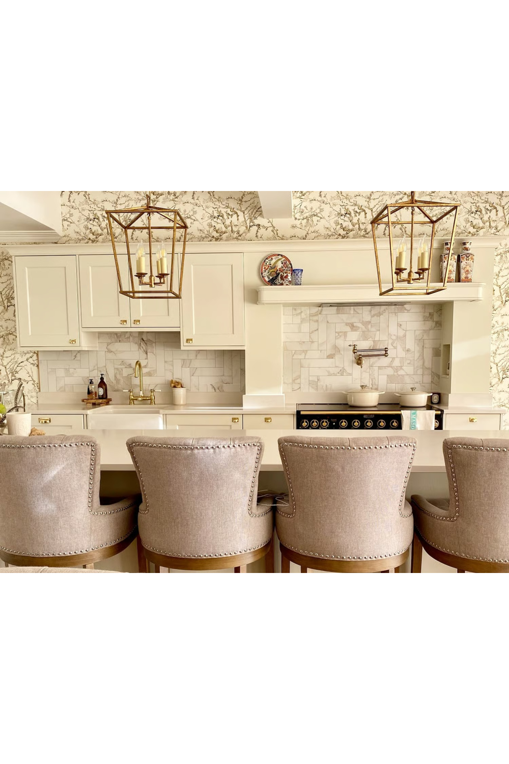 A traditional lantern pendant light in gilded iron with faux candles, Darlana breathes old-world charm. Designed by lighting icon E.F. Chapman, it is available in five sizes to fit all spaces.