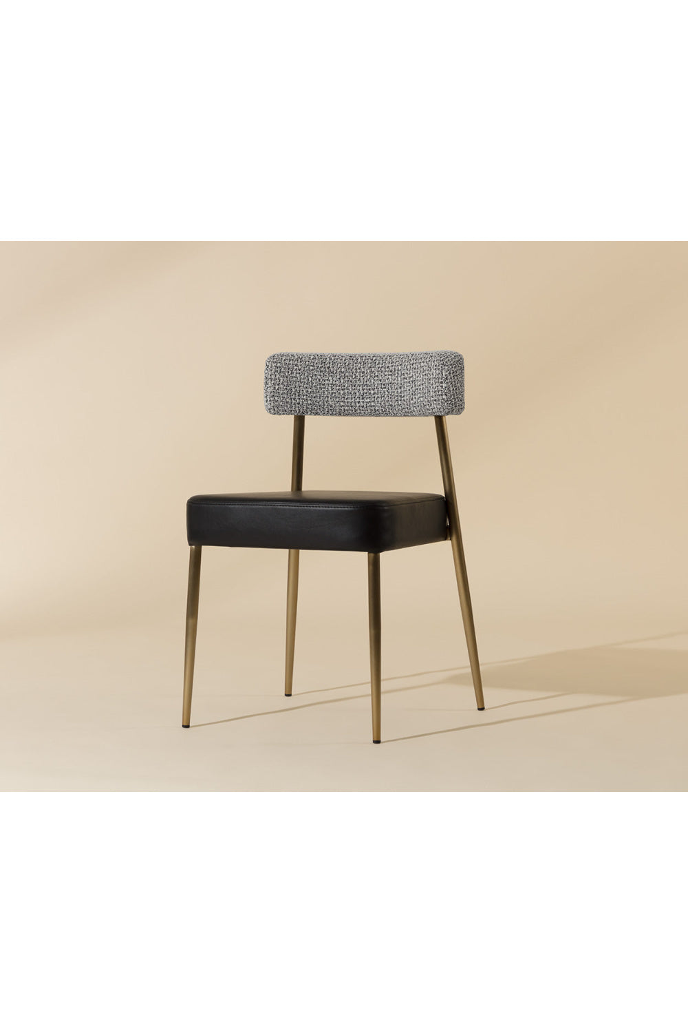 The Ashwin Stackable Dining Chair exudes effortless style with clean functional design. Textured fabric on the curved backrest contrasts with the smooth kona backwoods seat for a sophisticated look. A sturdy powder-coated steel frame in a luxe gold finish enhances its modern appeal.