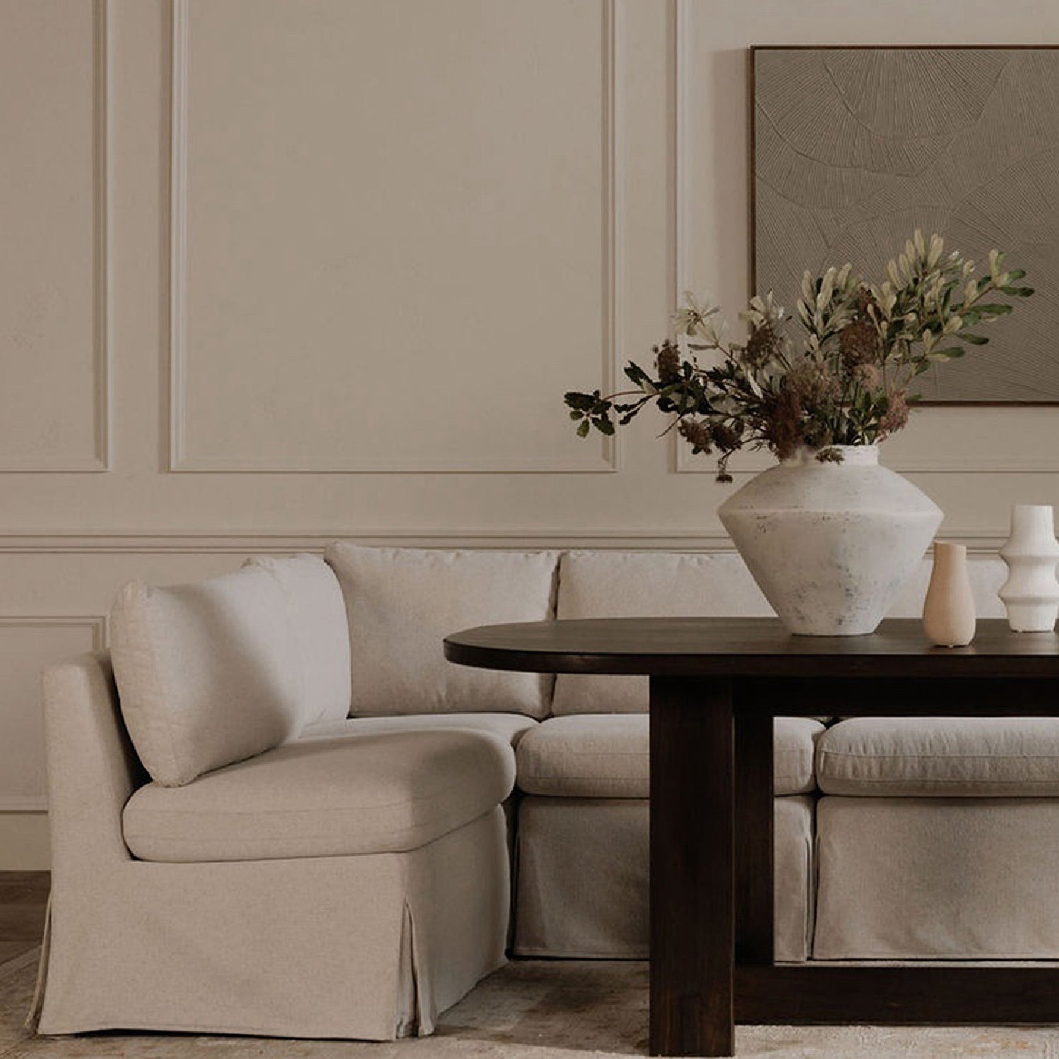 Beige L-Shaped Dining Banquette Slipcover S | Novi Living Fable is backordered and will ship as soon as it is back in stock.