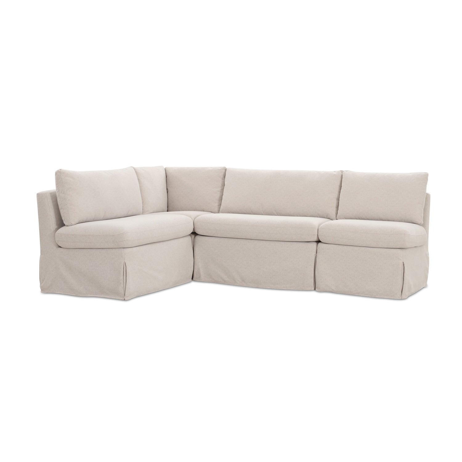 The Fable slipcover dining banquette L-shape's snug-fitting, washable slipcover with inverted pleats offers a tidy appearance and effortless upkeep. A slight tilt encourages a relaxed seating posture with a pillow back and seat cushions for comfort. Designed to be modular, it includes alligator clips to connect with other pieces in the collection, adapting seamlessly to various dining table sizes.