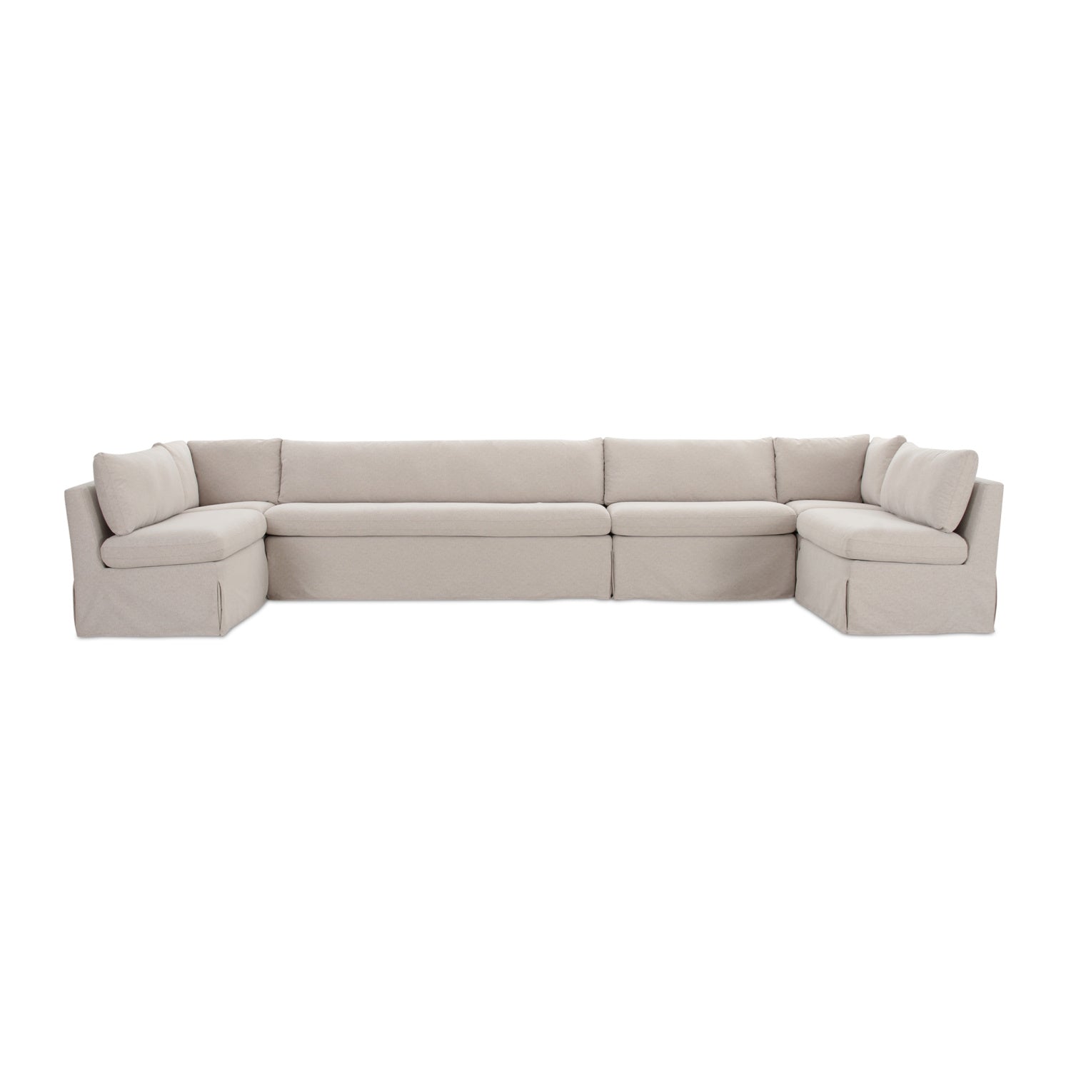 The Fable slipcover dining banquette U-shape's snug-fitting, washable slipcover with inverted pleats offers a tidy appearance and effortless upkeep. A slight tilt encourages a relaxed seating posture with a pillow back and seat cushions for comfort. Designed to be modular, it includes alligator clips to connect with other pieces in the collection, adapting seamlessly to various dining table sizes.