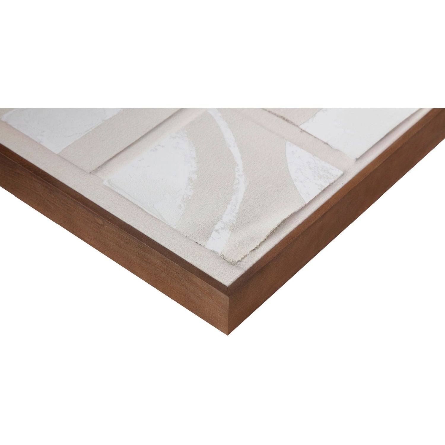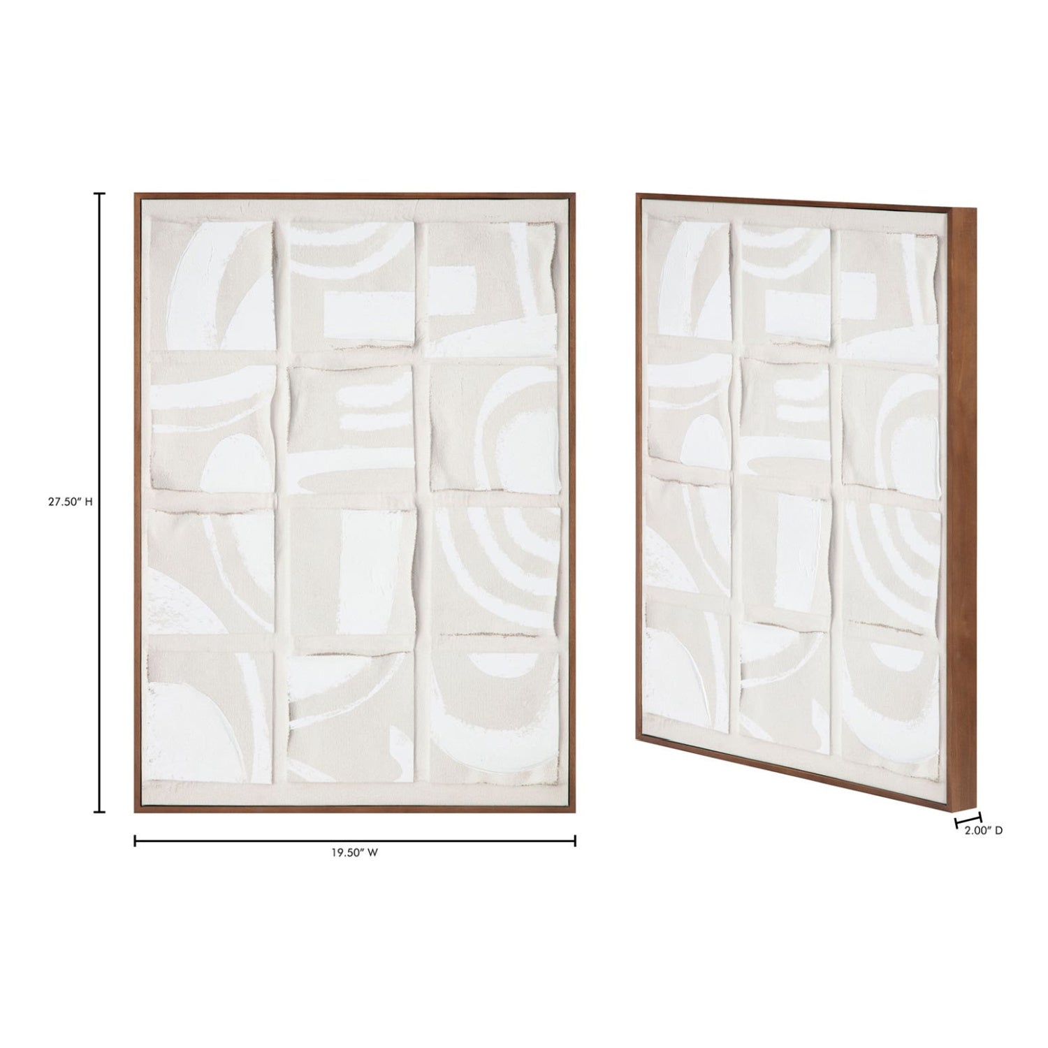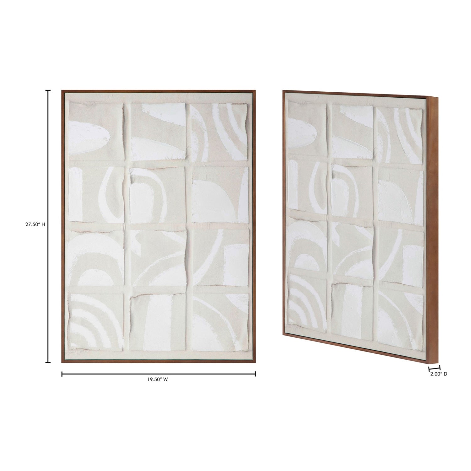 Inspired by the Dadaist movement and collage art, Unfold 1 and 2 is an homage to Ellsworth Kelly's "Cité," where ink strokes were brushed across a sheet of paper, cut into twenty squares, and randomly recomposed in a grid pattern. Shadowed tones add depth and dimension to the collage-like squares, while a neutral color palette and irregular shapes offer a softness to the sharp shapes—a remarkable abstract piece expertly finished with a solid pine frame.