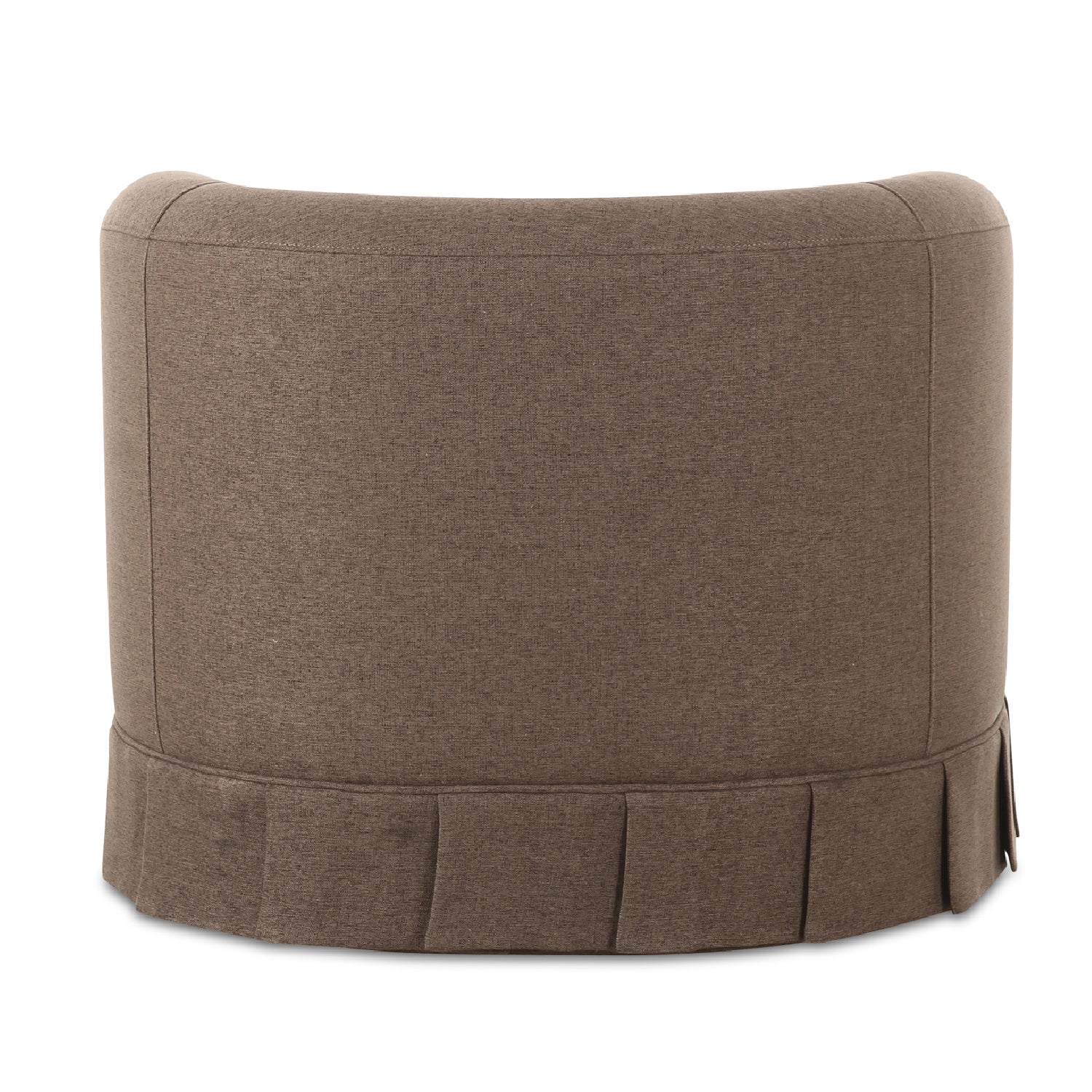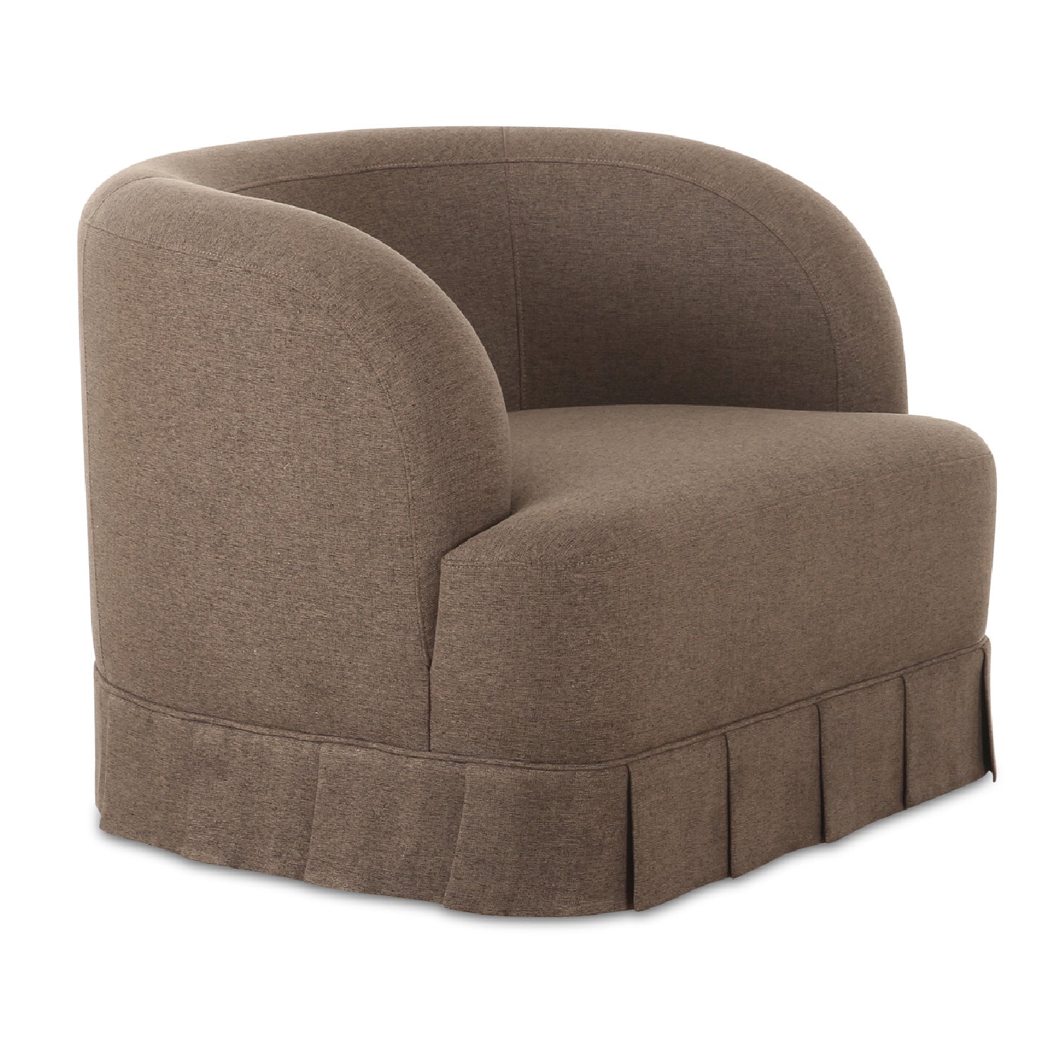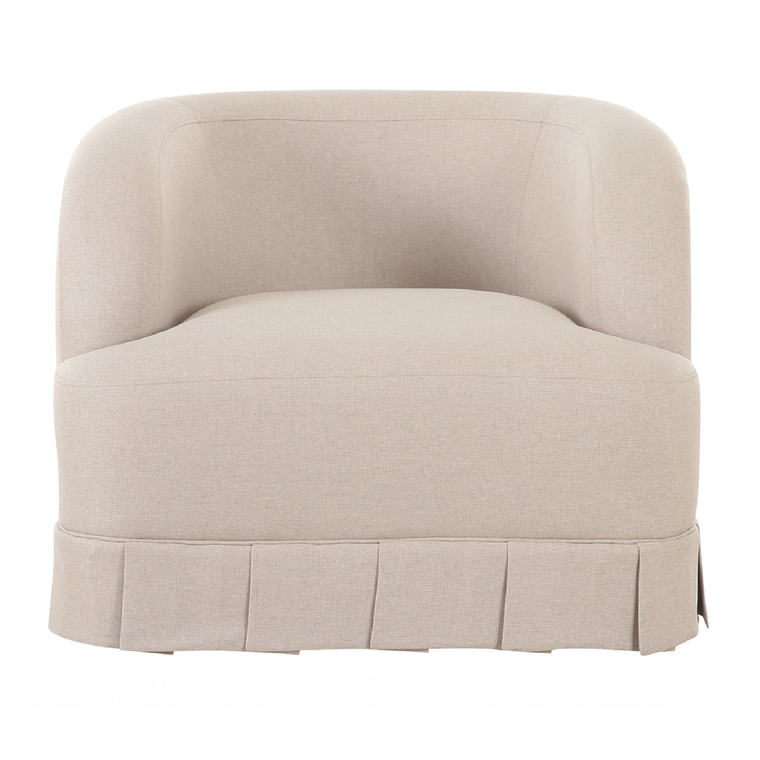 The Maren swivel chair exudes a soft, feminine aesthetic, upholstered in a warm, neutral fabric and featuring a playful yet refined box pleat base reminiscent of vintage finesse, straddling the line between contemporary form and traditional finish. With smoothly rounded corners and graceful, curving forms adding softness to the design, this piece is a study in elegance and subtlety.