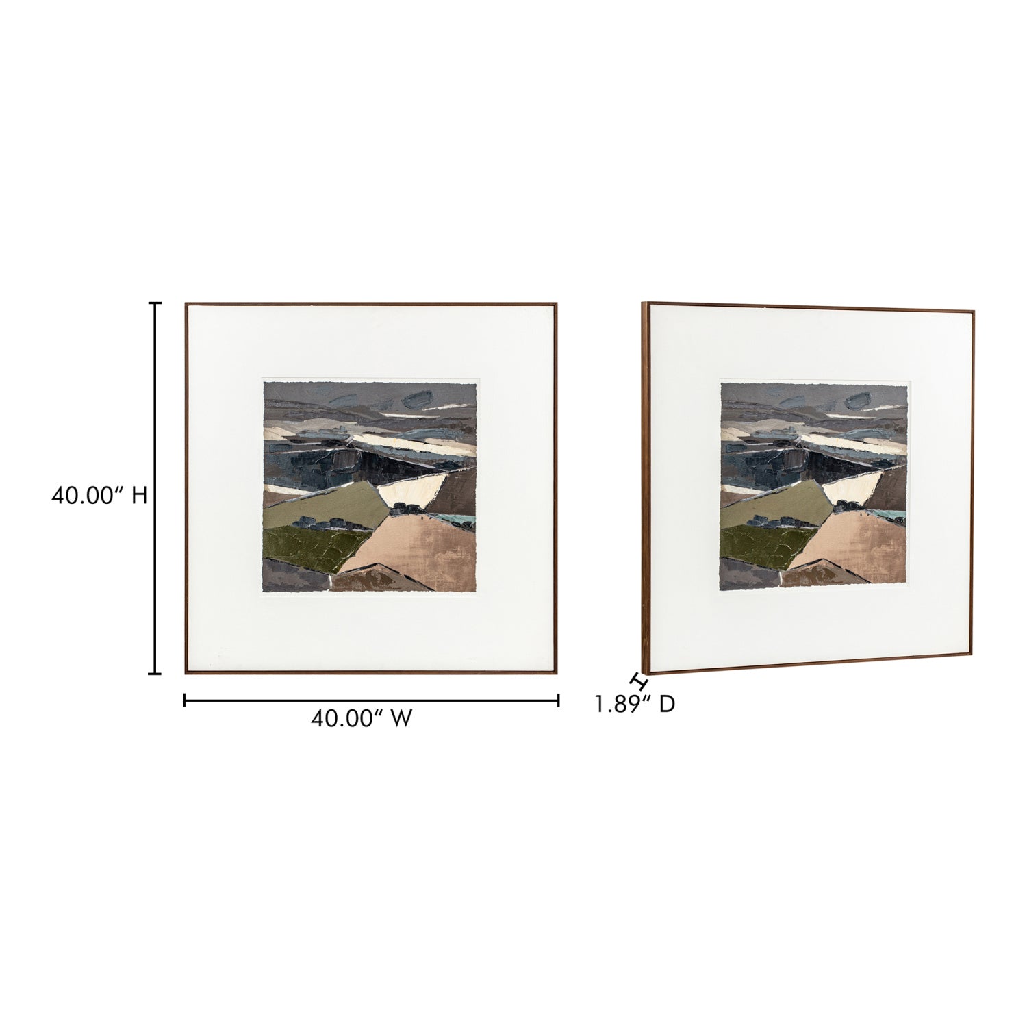 The Vale framed painting captures an abstract landscape in a dance of cool and warm tones, suggesting a vintage essence and heritage richness. Dark grey blues meld with earthy warmth, creating a moody yet grounding atmosphere. A wide matte border elegantly encases the free-form natural elements, offering both focal depth and refined stability.