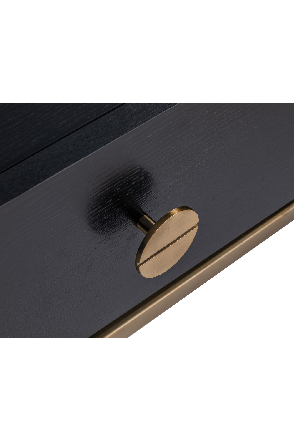 Our Rhapsody bedside table is a sleek and modern combination of beautifully figured crown ash veneer and brushed brass. In our signature, Black Ash finish, the generously sized drawer is punctuated with a slotted rivet handle and elevated on an elegant brushed brass finish base.