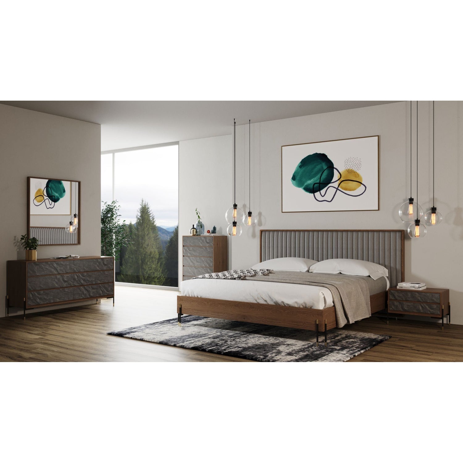 The modern and rustic styles of the Metcalf Mid-Century Chest are perfect for your contemporary home. The Walnut veneer surrounds five soft close drawers, finished in a faux volcanic rock facing. Perfect for a modern or industrial space, this piece is sure to shine. Pair with the Metcalf Bed, Nightstand, Dresser, and Mirror.