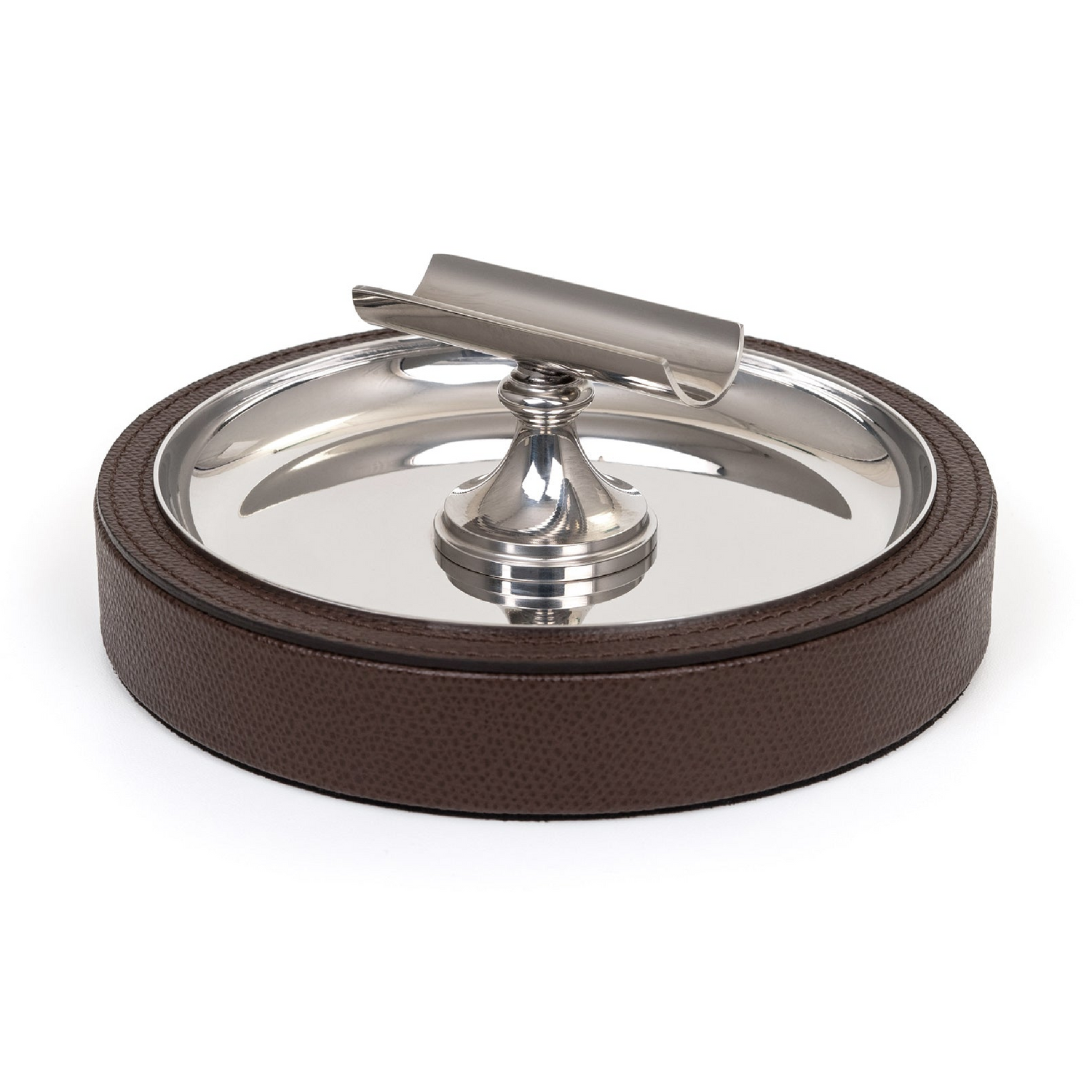 Elevate your poker nights with this elegantly crafted cigar ashtray, designed for both functionality and style. Featuring a compact polished steel body paired with a wooden base trimmed in soft calf leather, it offers a single rest to hold your cigar securely. Available in various leather types and colors, this sophisticated piece complements any cigar lover’s collection while adding a refined touch to your setting.