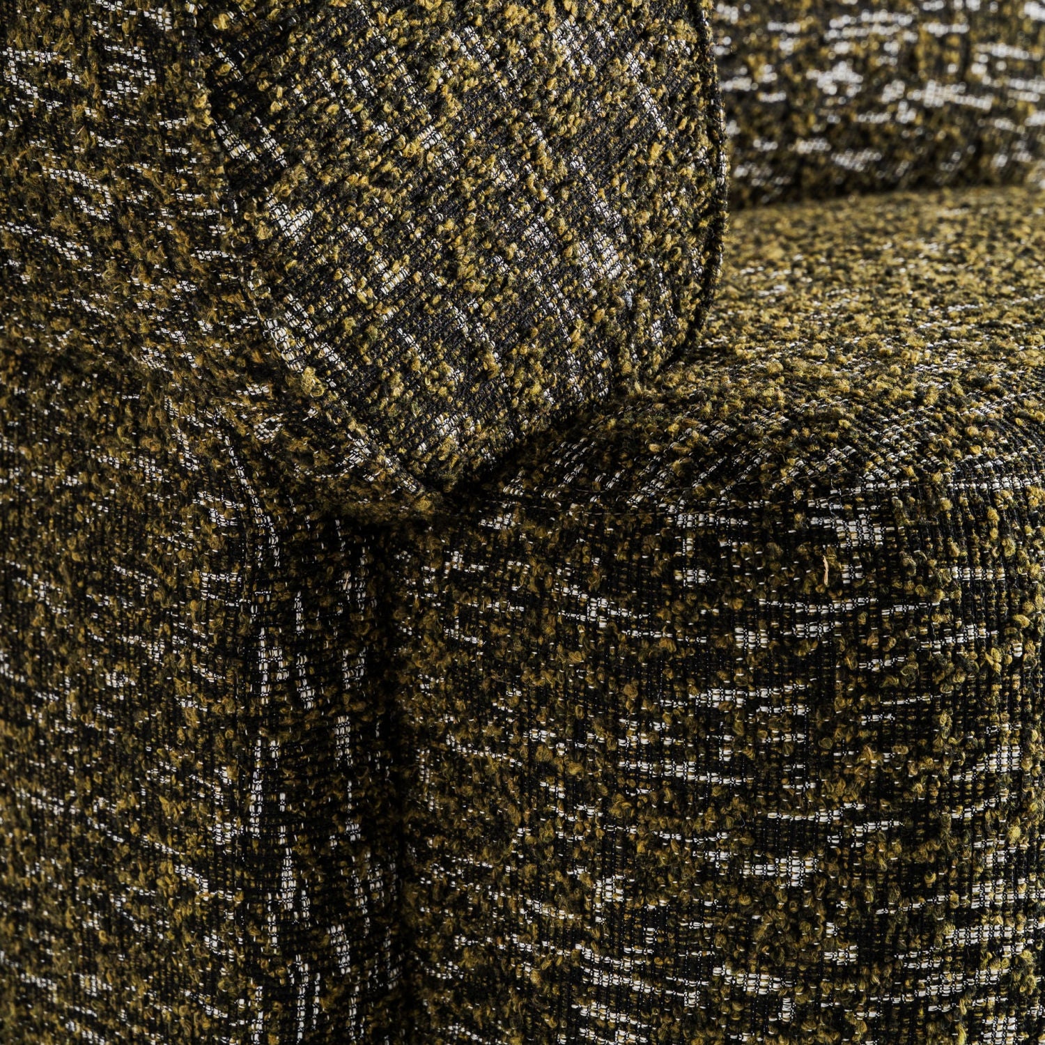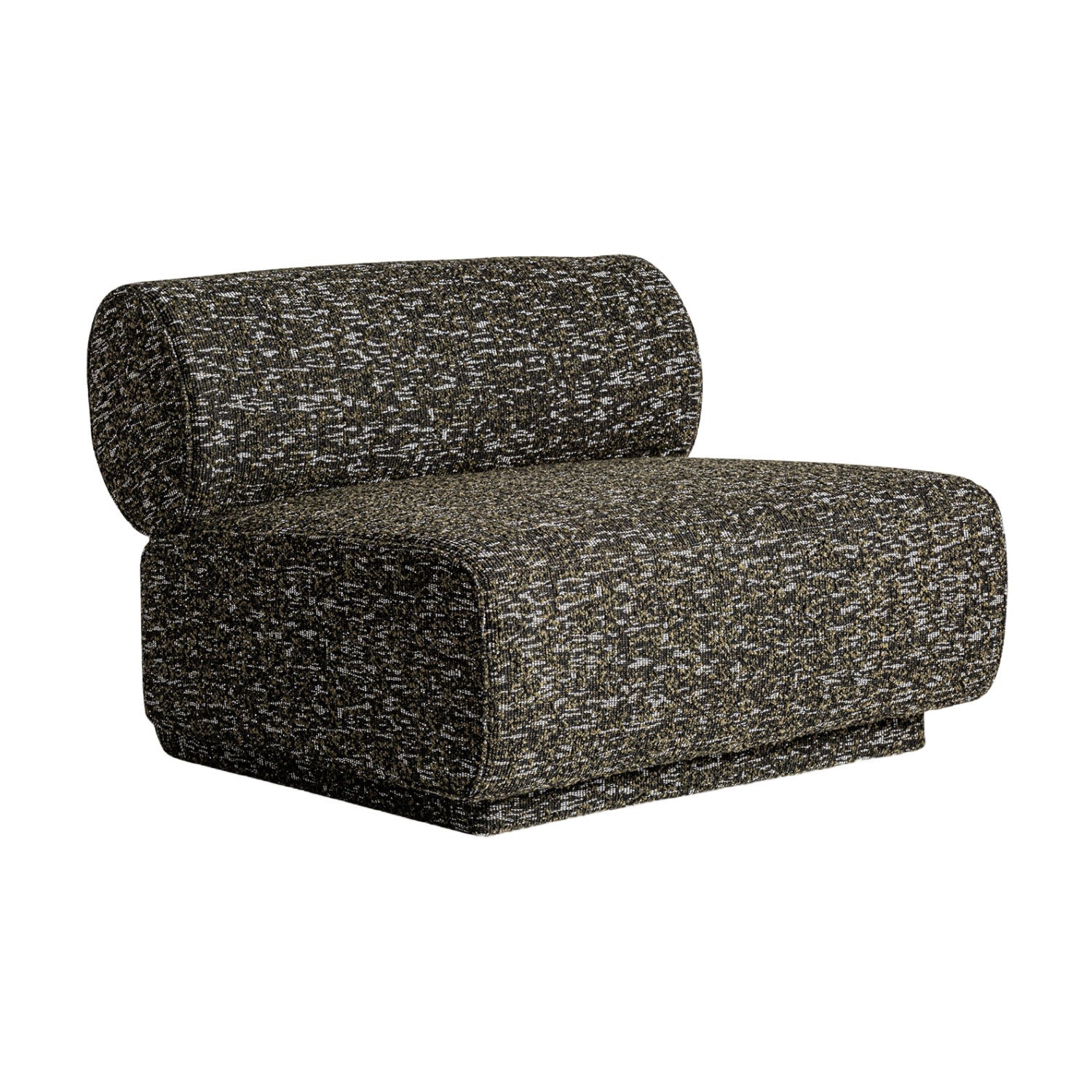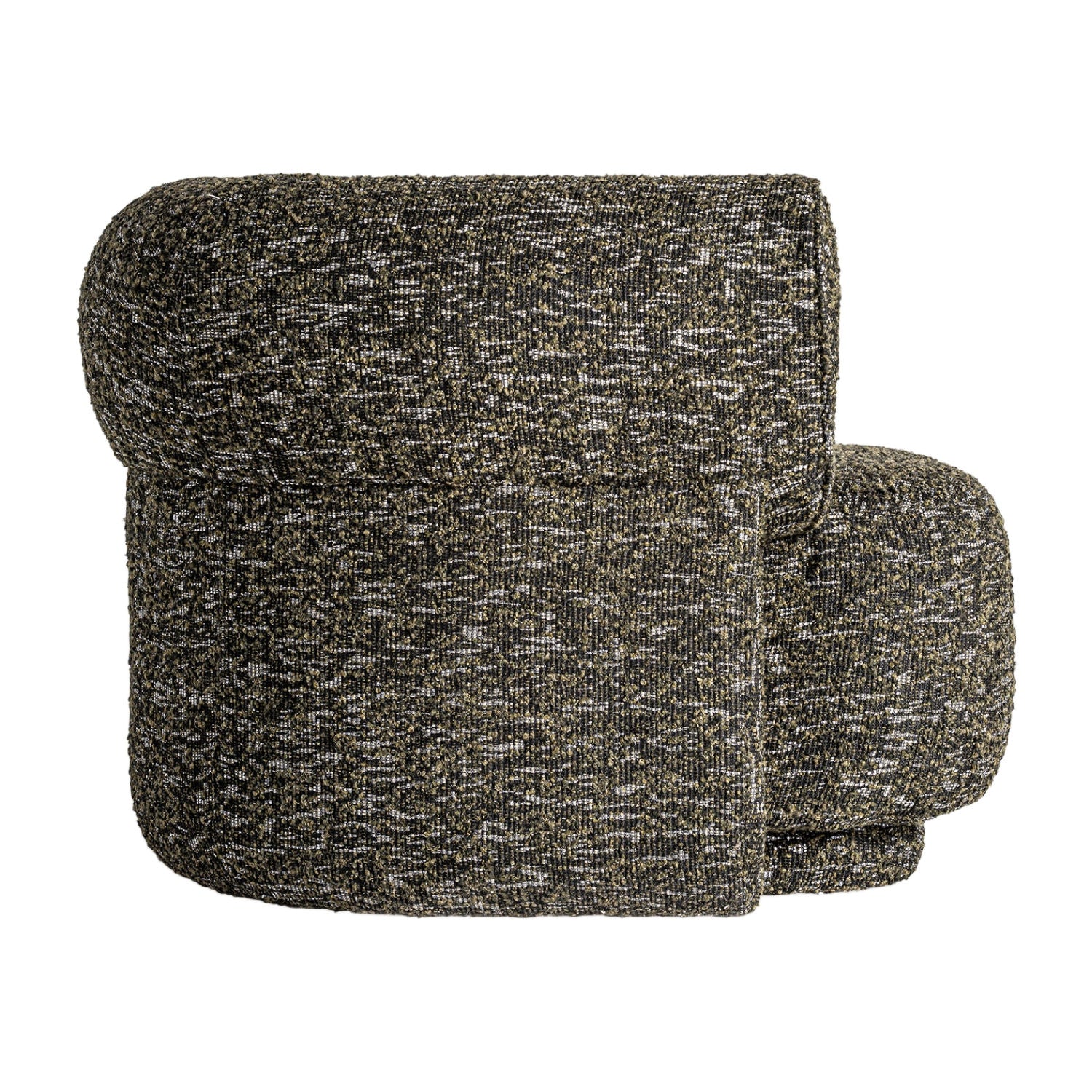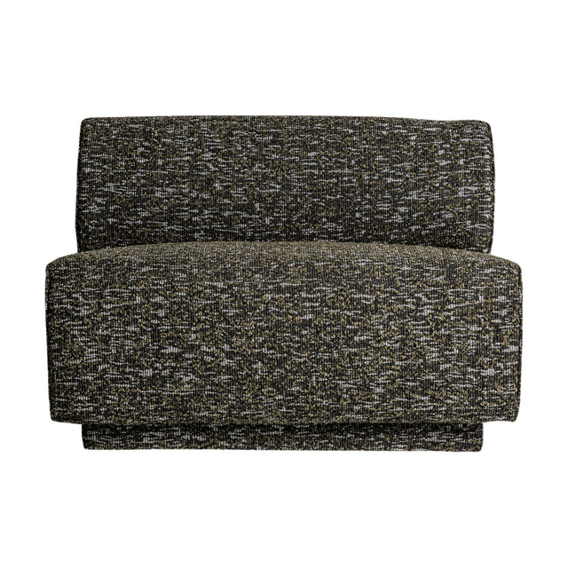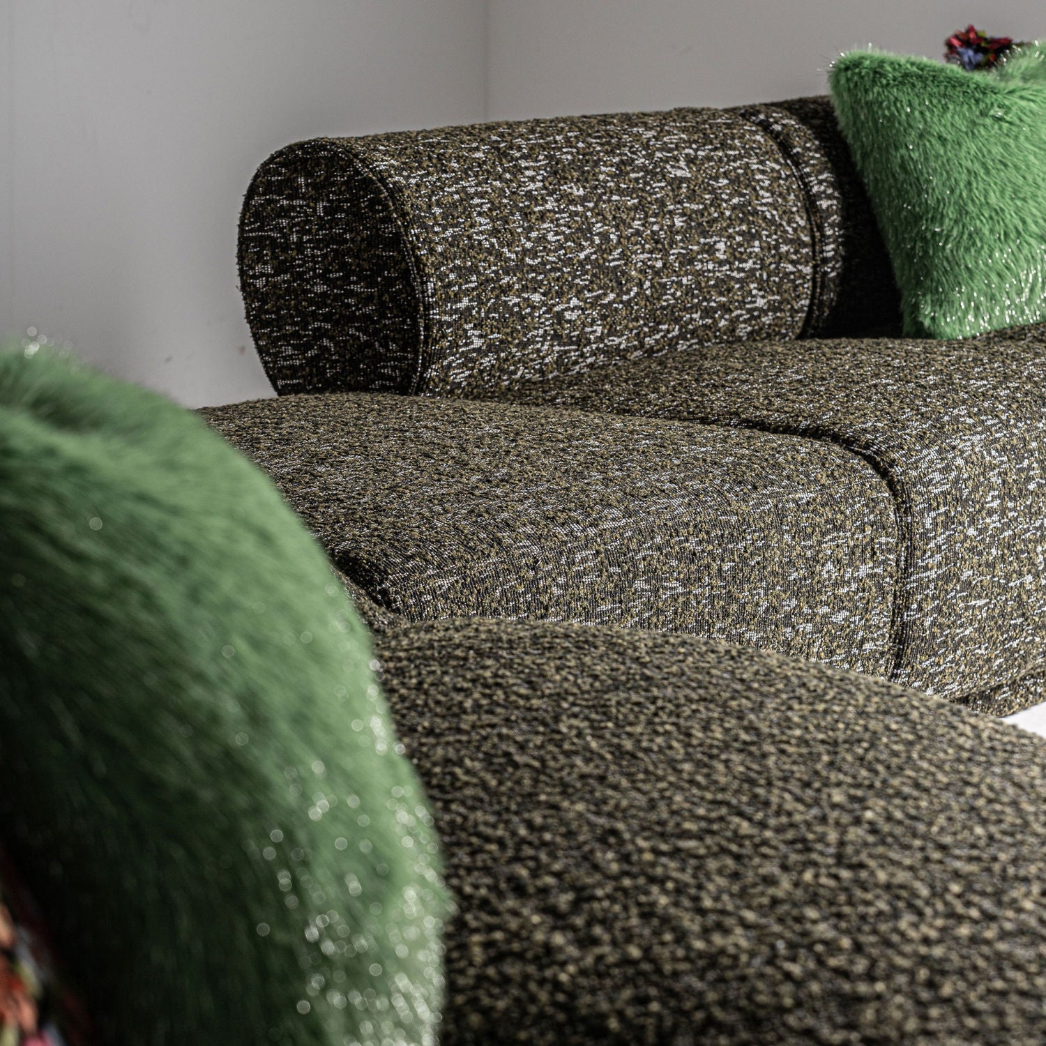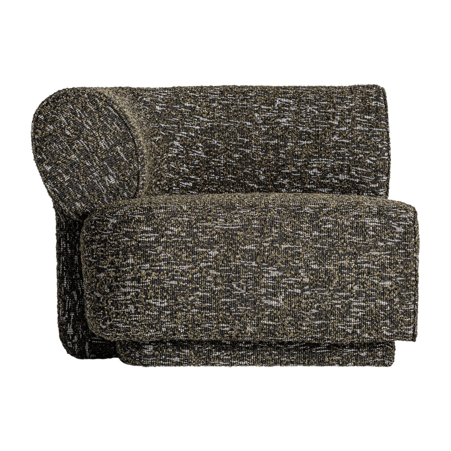 The Kozly Corner Module by Vical, in its symmetrical version, maintains the same enveloping aesthetic and mottled green upholstery. Designed to integrate seamlessly into modular compositions, it provides visual continuity and comfort.