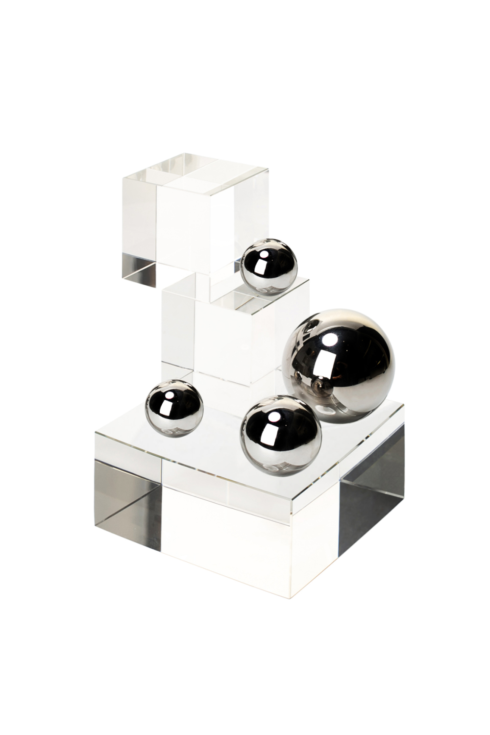Reminiscent of the challenging works of Vasarely the Descent plays with space and stability with a silvered sphere balanced seemingly precariously on a glass staircase base. Perfect as a glamorous bookend or shelf decor.