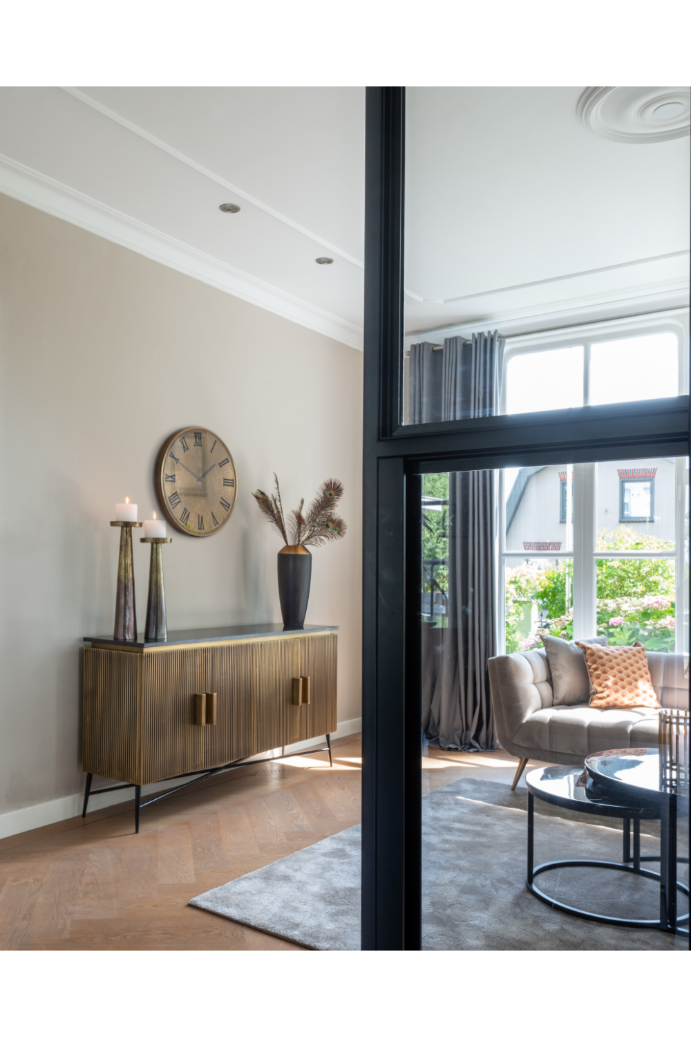 The Huxley sofa by Richmond Interiors is solidly built from wooden framework and khaki velvet upholstery. Its deep channel stitching and brushed gold legs make it all the more characterful. A must-have for a cozy and stylish living area.