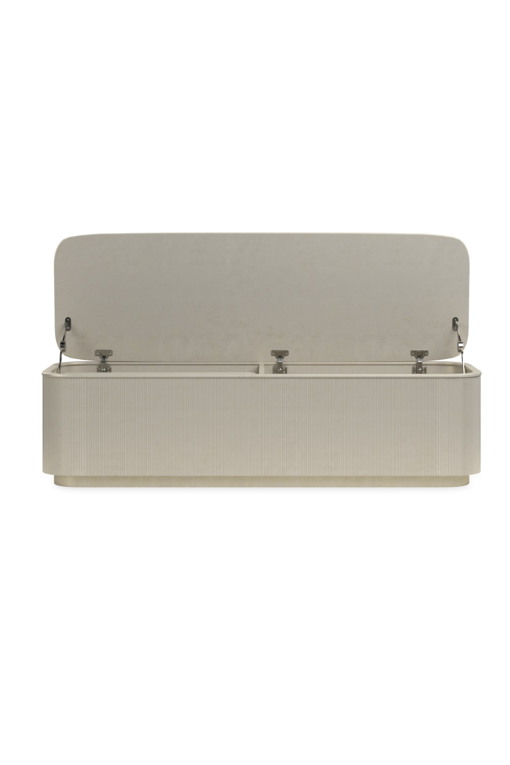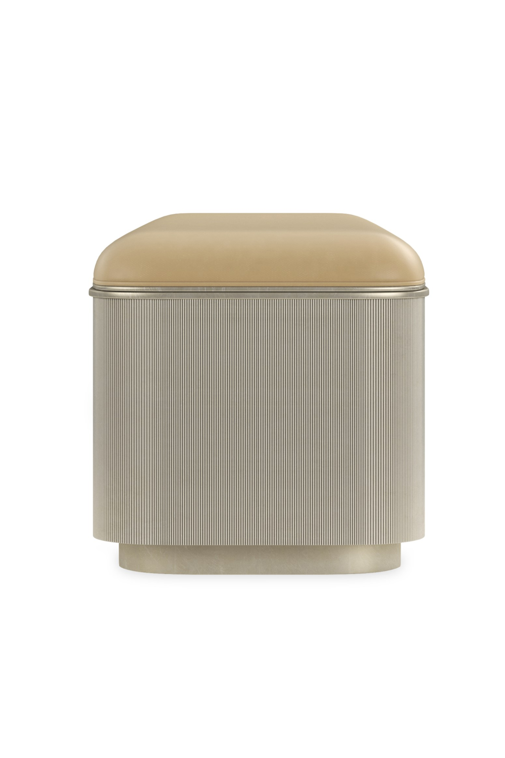 Storage has never felt so fashionable than with this luxe storage ottoman. Its lovely, fluted exterior is highlighted in gleaming Oracle gold or in Dark Chocolate. Upholstered in a sophisticated neutral fabric or Camel pebbled leather, its top seat cushion opens to reveal lighted storage with one tray on the left side. The bench has metal feet in Whisper of Gold. Use it on its own or as a pair in nearly any room for a touch of signature style.