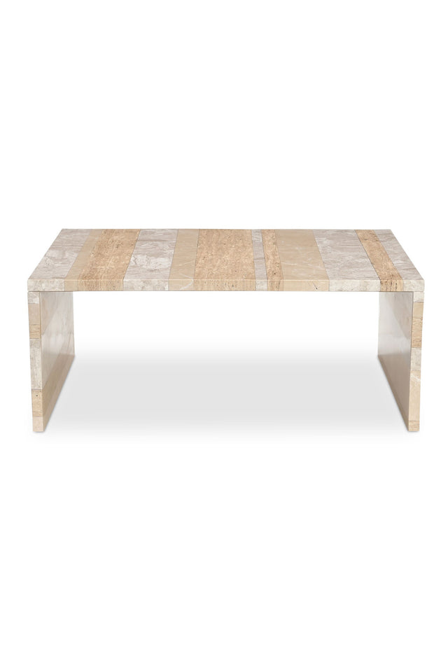 The bold simplicity of the waterfall design speaks volumes with the Rosa coffee table's versatility. The table is singularly impactful and crafted from beautiful sections of different types of neutral-toned marble with a generous scale and thickness to create a substantial look. This piece commands attention as a statement of natural elegance.