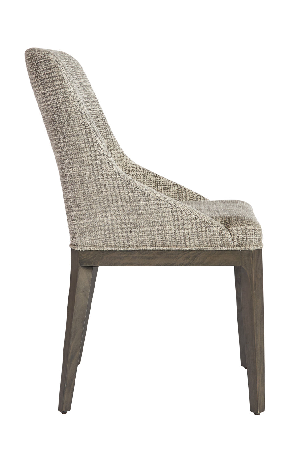 Dine in style and comfort in this fabulous dining chair that features a tasteful cutout in the seatback. Completed with fabric upholstery and features solid poplar wood legs in a light gray oak finish. As wood is an organic, porous material, these pieces will contain natural variation of texture and may also exhibit fine indentations and cracks. Wood pieces will also display a disparity of color and grain, and visible knots and burls that add to the character of each piece.