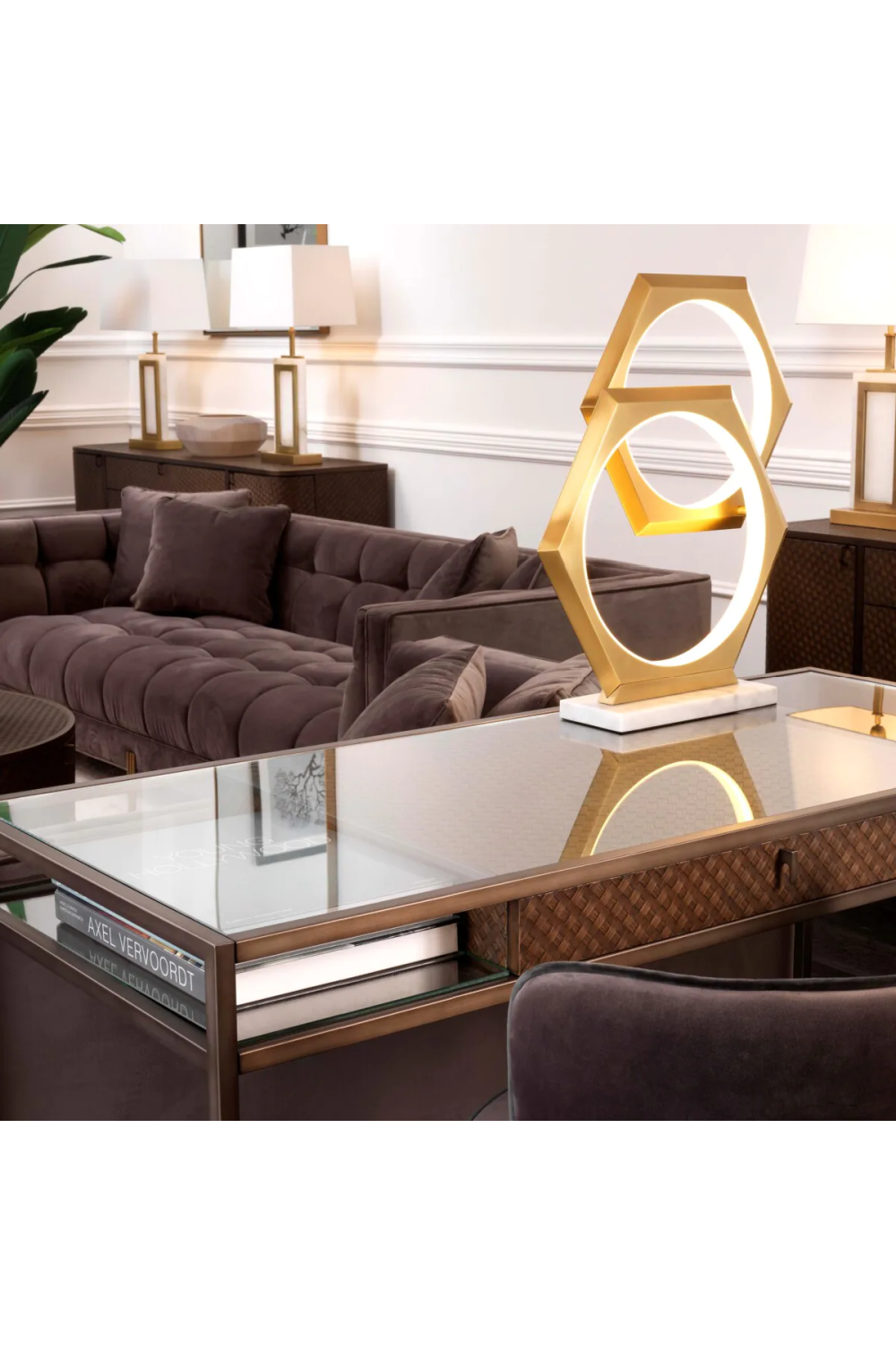 Pairing Bauhaus style with a Mid-Century Modern look, the Napa Valley Desk showcases a sleek frame with a brushed brass finish and stainless steel frame a clear glass top, and a drawer of woven washed oak veneer.