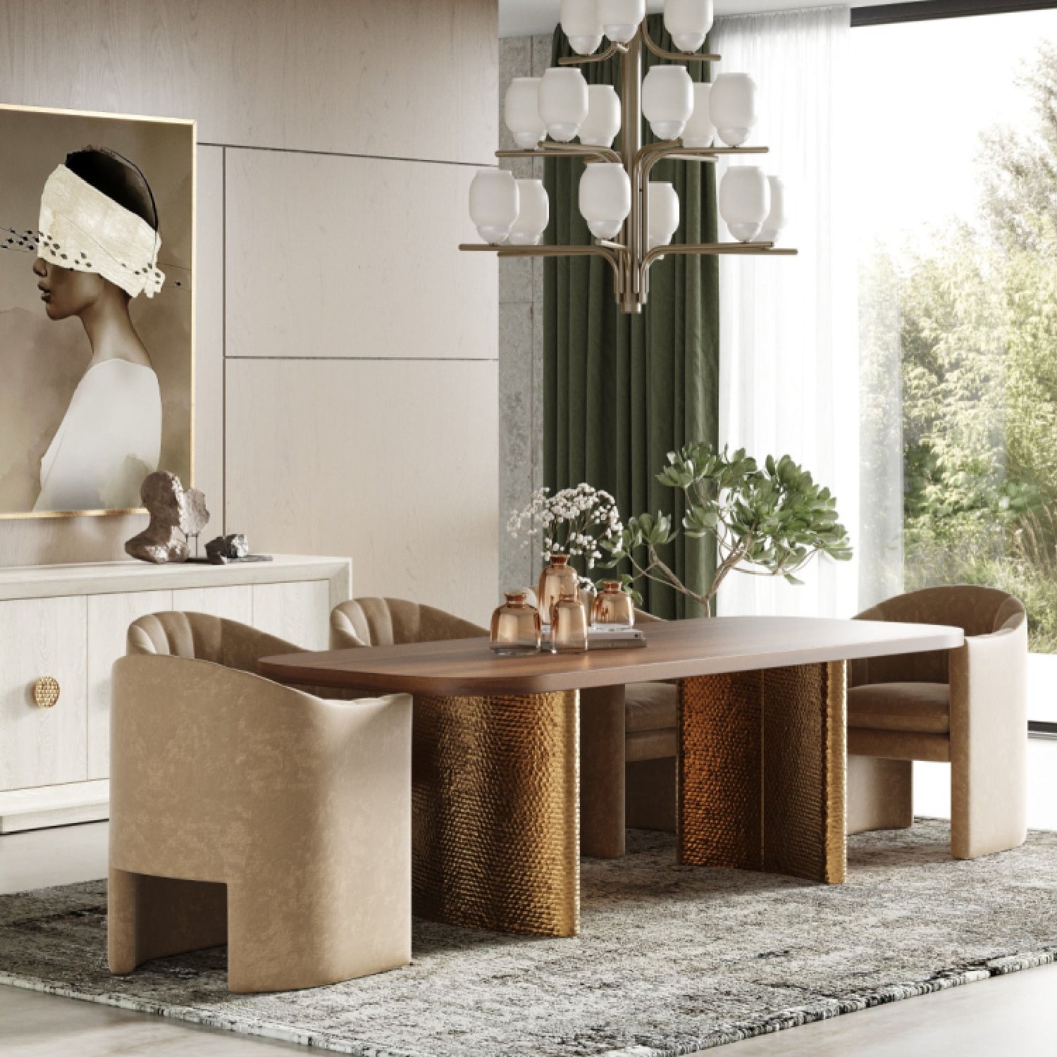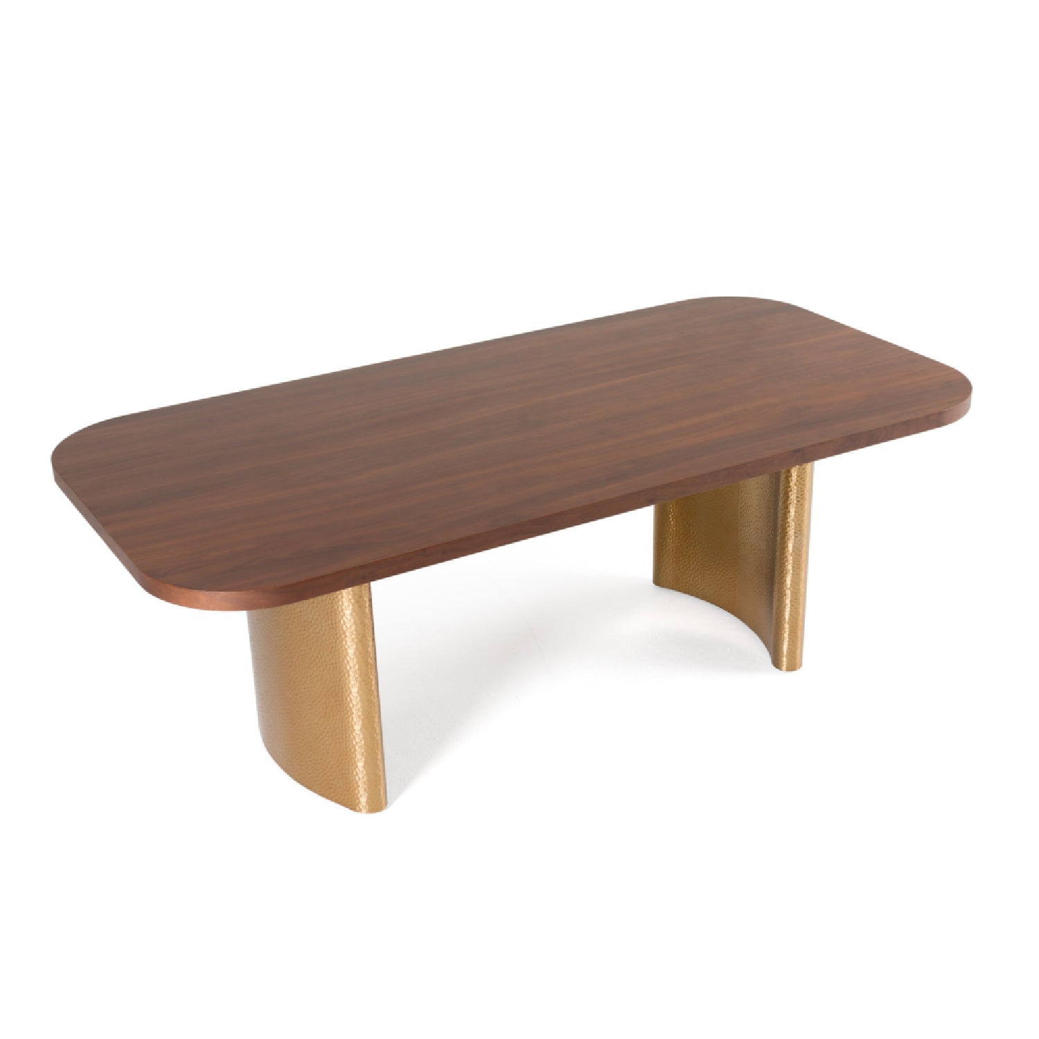 Dine in style with the Marjorie Dining Table! This modern table features a Walnut Veneer table top and Brushed Gold Stainless Steel Double Pedestal Legs that offer a stylish addition to your dining room. Able to seat up 8 people, the Marjorie combines excellent quality materials and superb design that makes it a stunner in any dining space.