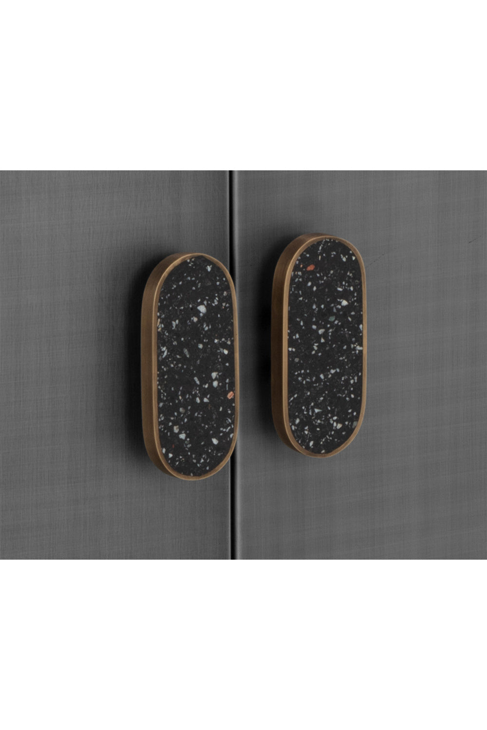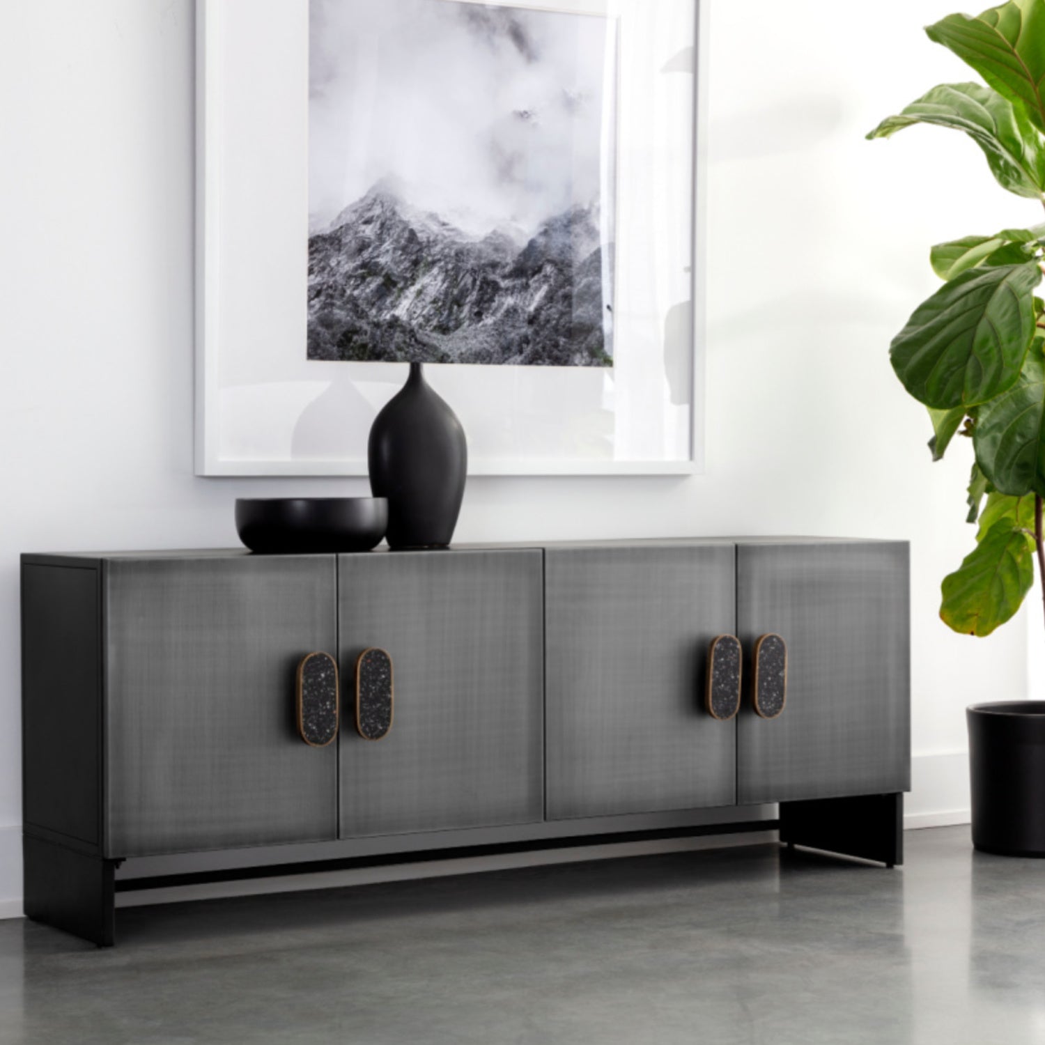 Add a cool and moody atmosphere to your dining space with the Viserys Sideboard. Features a black powder-coated frame and black terrazzo marble handles. Antique zinc iron doors add a faded, lived-in look to the piece. With refined craftsmanship, this design was brought to life by skilled local artisans. Due to the nature of handcraftsmanship, unique imperfections such as fissures, markings, and variations in color and shape are welcomed and appreciated characteristics for a truly one-of-a-kind piece.
