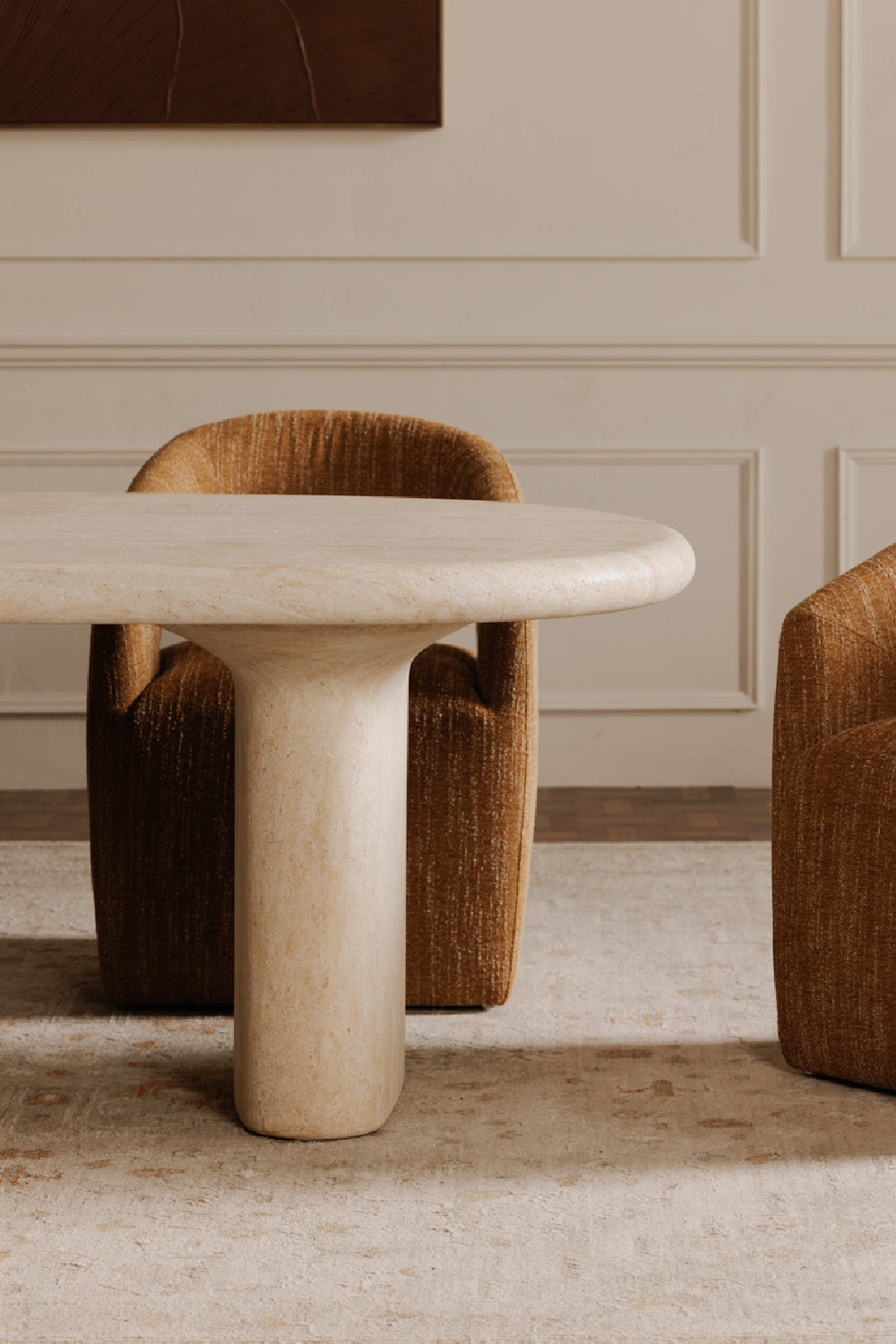 The Warby outdoor dining table is designed with a sense of playfulness and organic form and crafted through an innovative water transfer process that patterns onto concrete to give the sophisticated appearance of travertine. This technique provides the piece with the authentic feel of stone while maintaining the resilience of concrete.