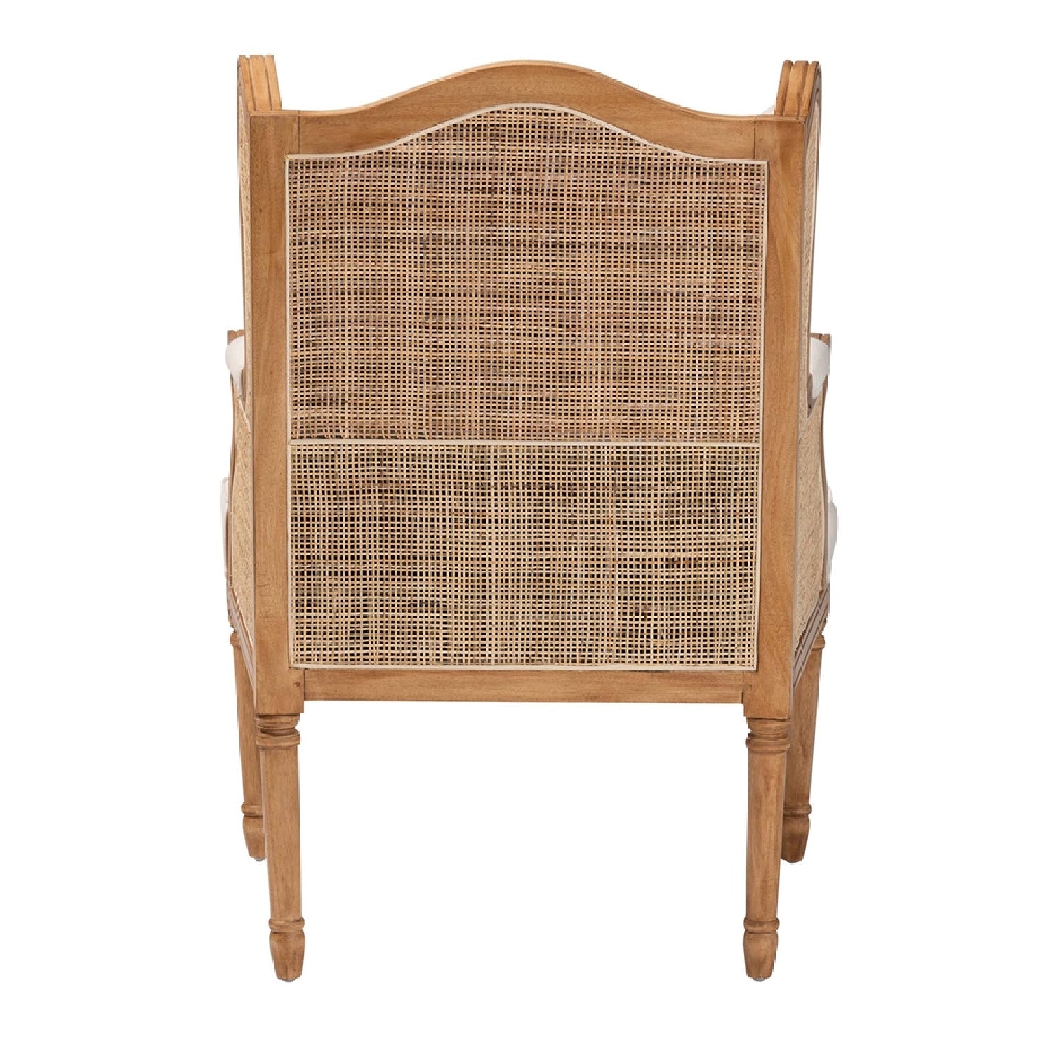 Elegant contouring and intricate design distinguish the unmatched charm of the Rachana accent chair. Made in Indonesia, this traditional French piece consists of a sturdy bayur wood frame padded with foam and upholstered in sumptuous fabric. Gorgeously crafted armrests extend forward to offer enhanced leisure while woven rattan accents lend rustic charm. The Rachana requires assembly and features spade legs for excellent stability and support in graceful design. Carved detailing highlights the superb craftsmanship, making the Rachana accent chair a marvelous example of timeless design.